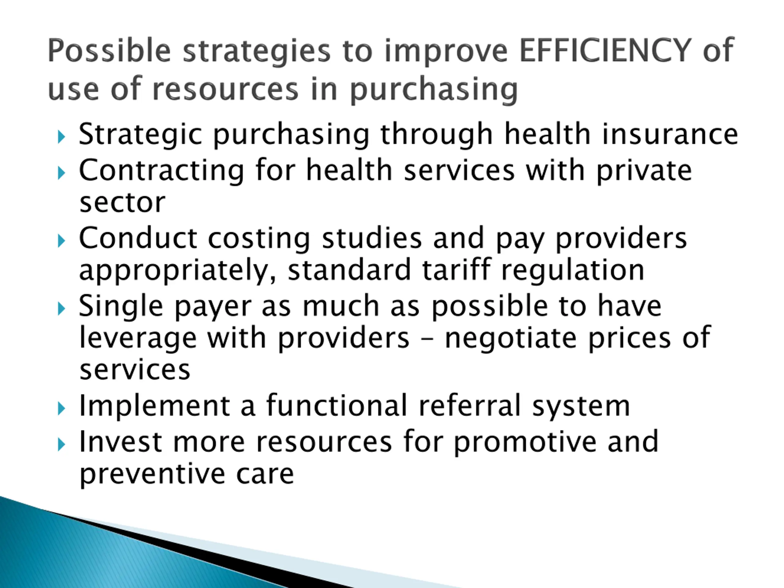 Strategic purchasing through health insurance Contracting for health services with private sector Conduct costing studies and pay providers appropriately, standard tariff regulation Single payer as much as possible to have leverage with providers negotiate prices of services Implement a functional referral system Invest more resources for promotive and preventive care