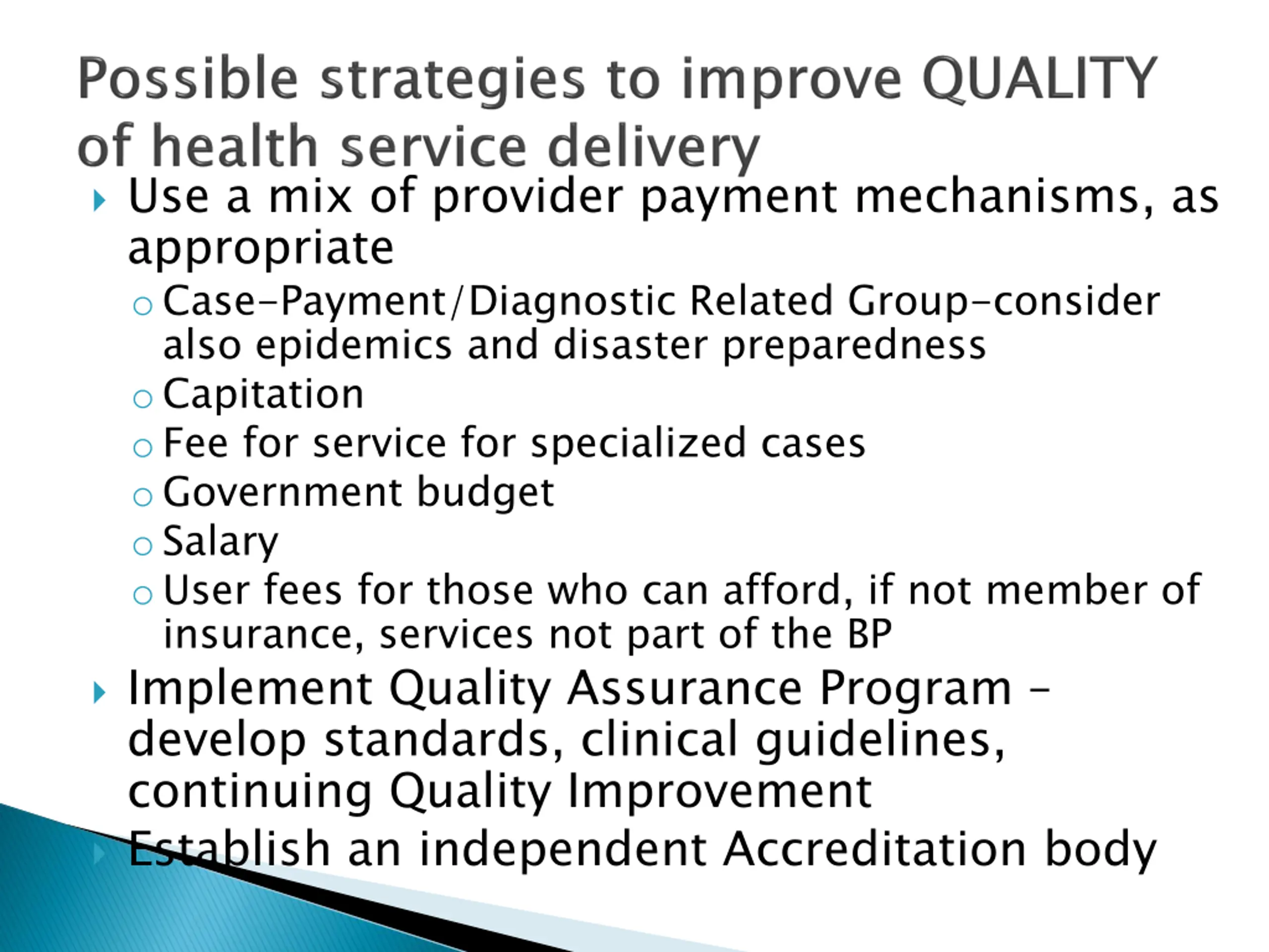 Use a mix of provider payment mechanisms, as appropriate oCase-Payment/Diagnostic Related Group-consider also epidemics and disaster preparedness oCapitation oFee for service for specialized cases oGovernment budget oSalary oUser fees for those who can afford, if not member of insurance, services not part of the BP Implement Quality Assurance Program develop standards, clinical guidelines, continuing Quality Improvement Establish an independent Accreditation body