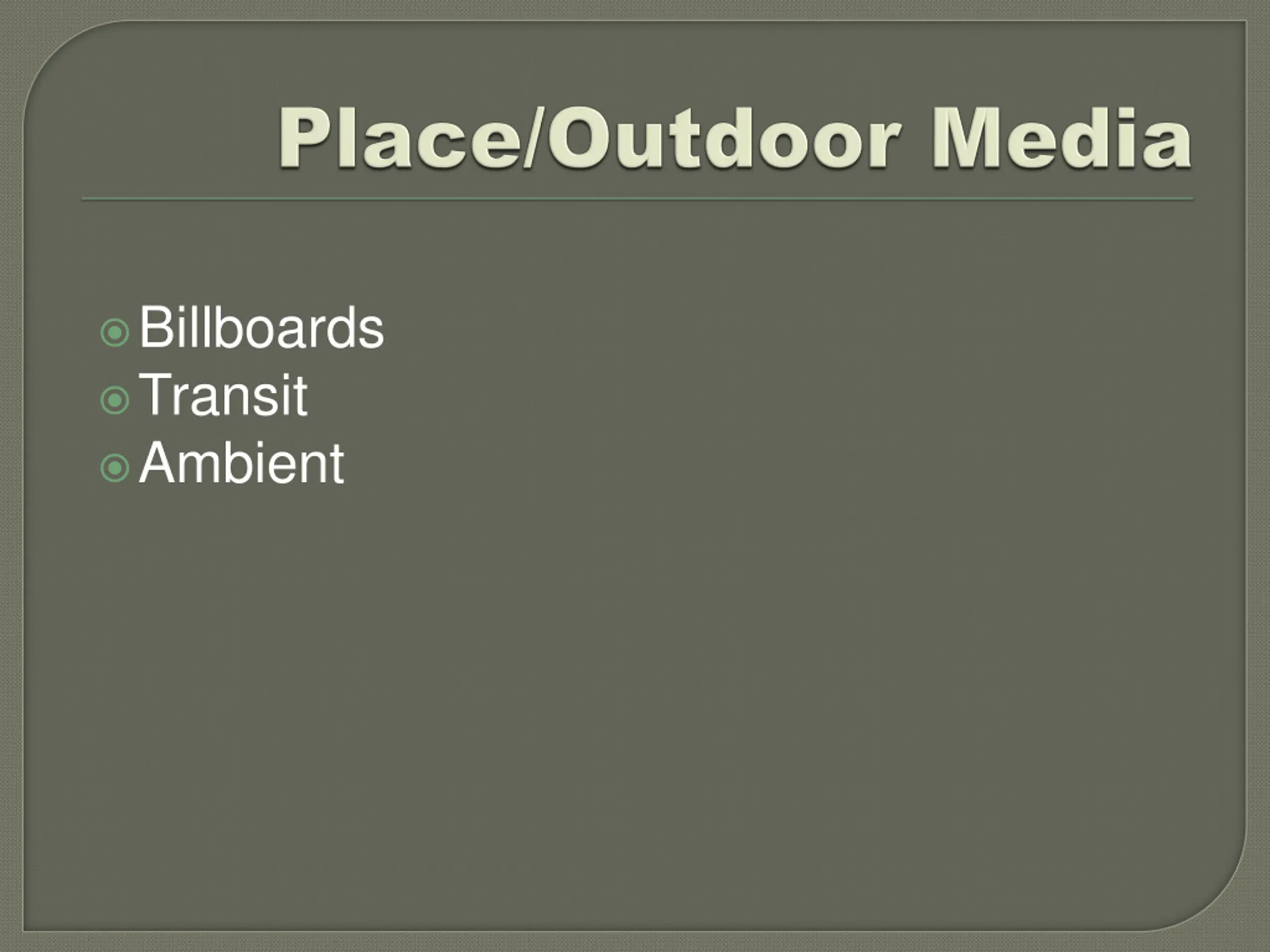 Print Media Place Media Broadcast Media Narrowcast Media