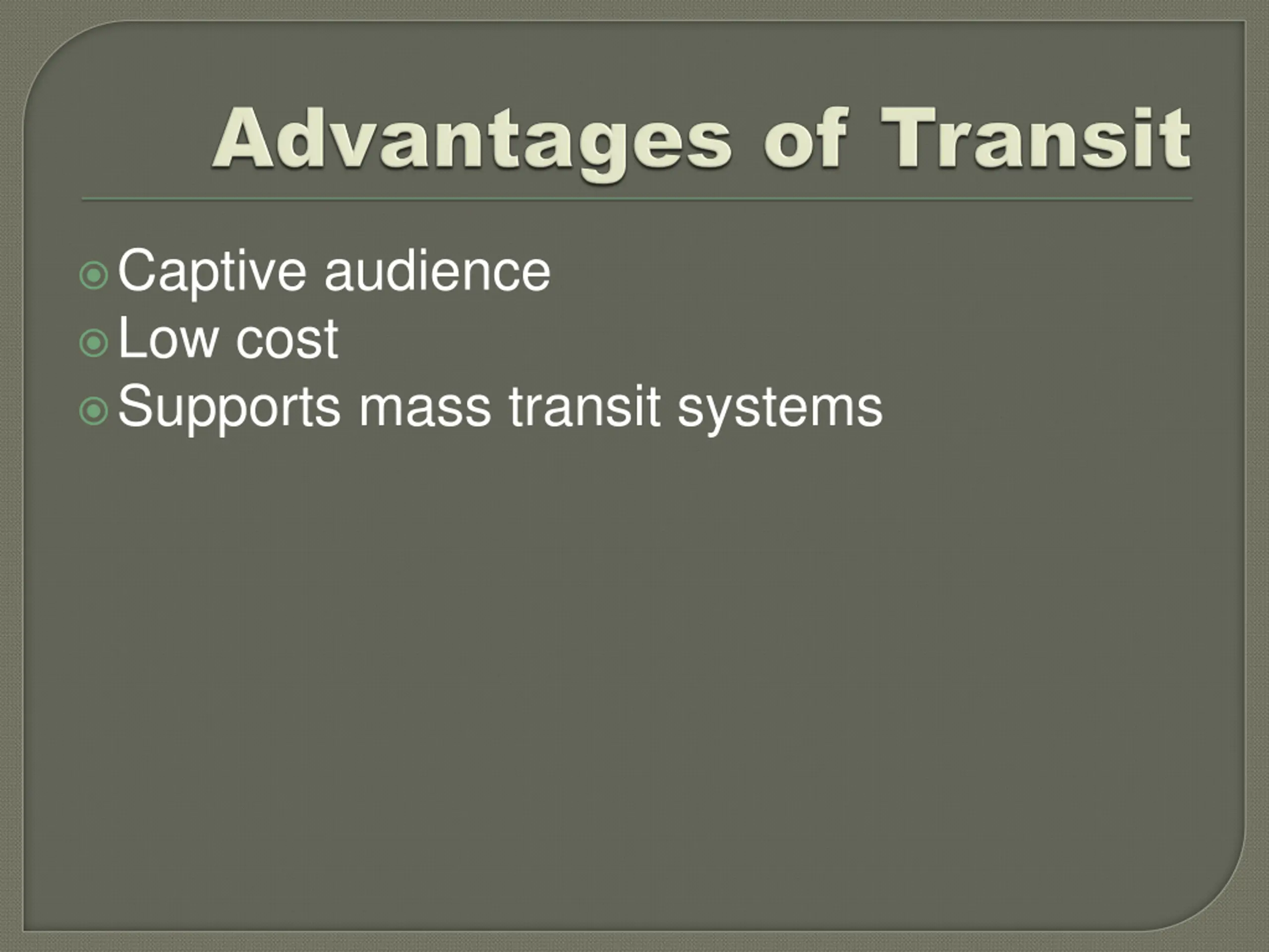 Captive audience Low cost Supports mass transit systems