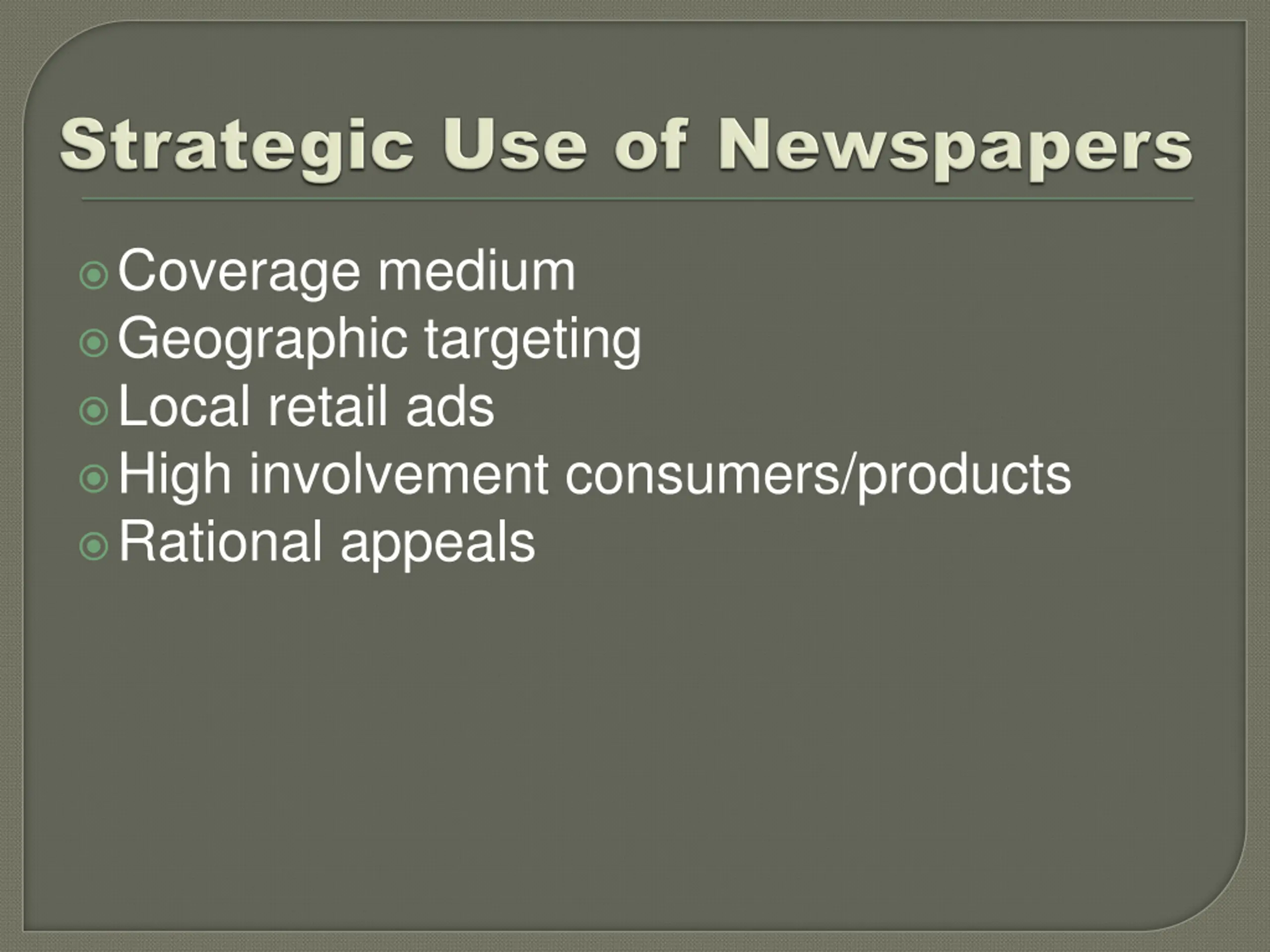 Coverage medium Geographic targeting Local retail ads High involvement consumers/products Rational appeals
