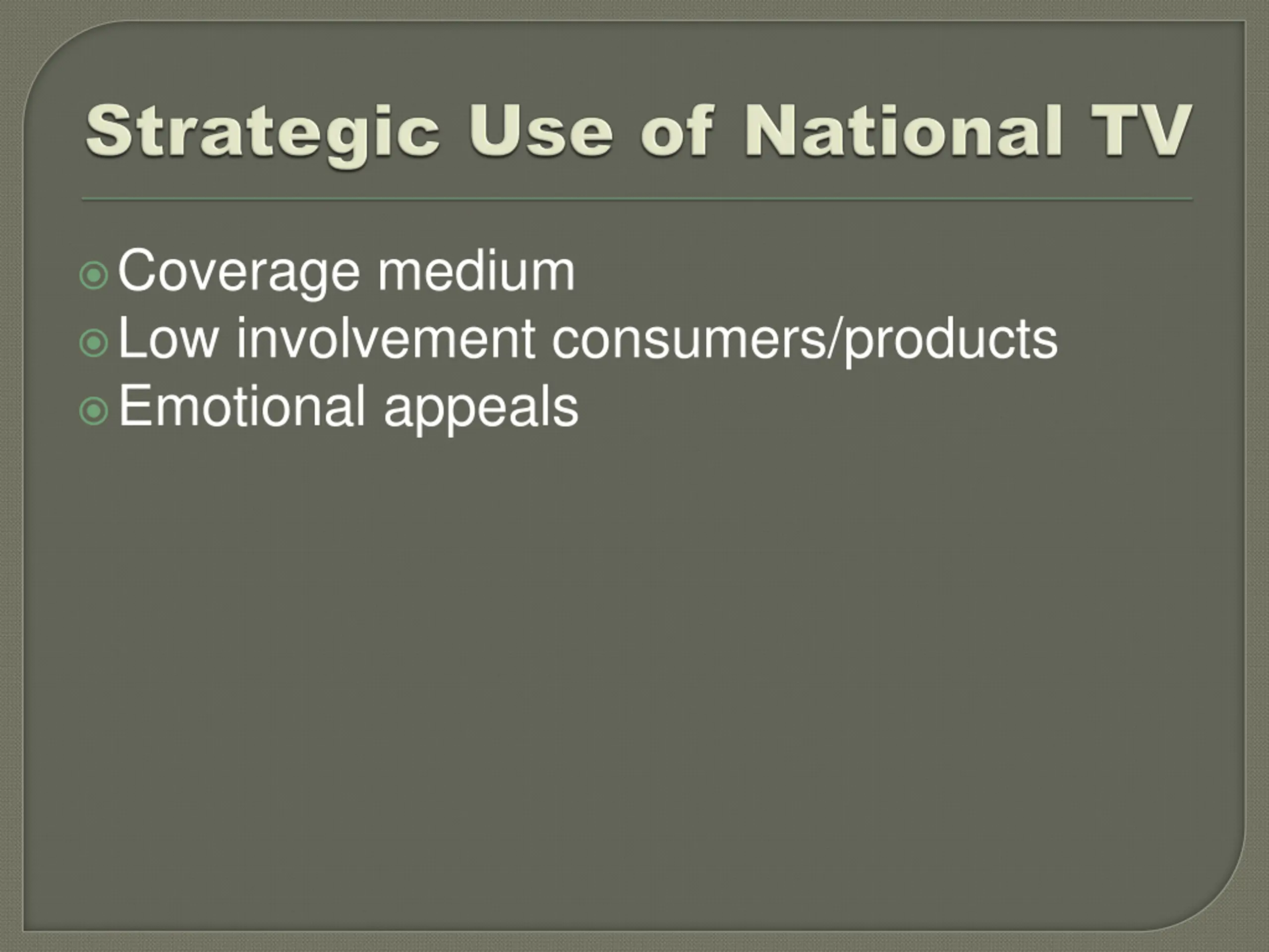 Coverage medium Low involvement consumers/products Emotional appeals