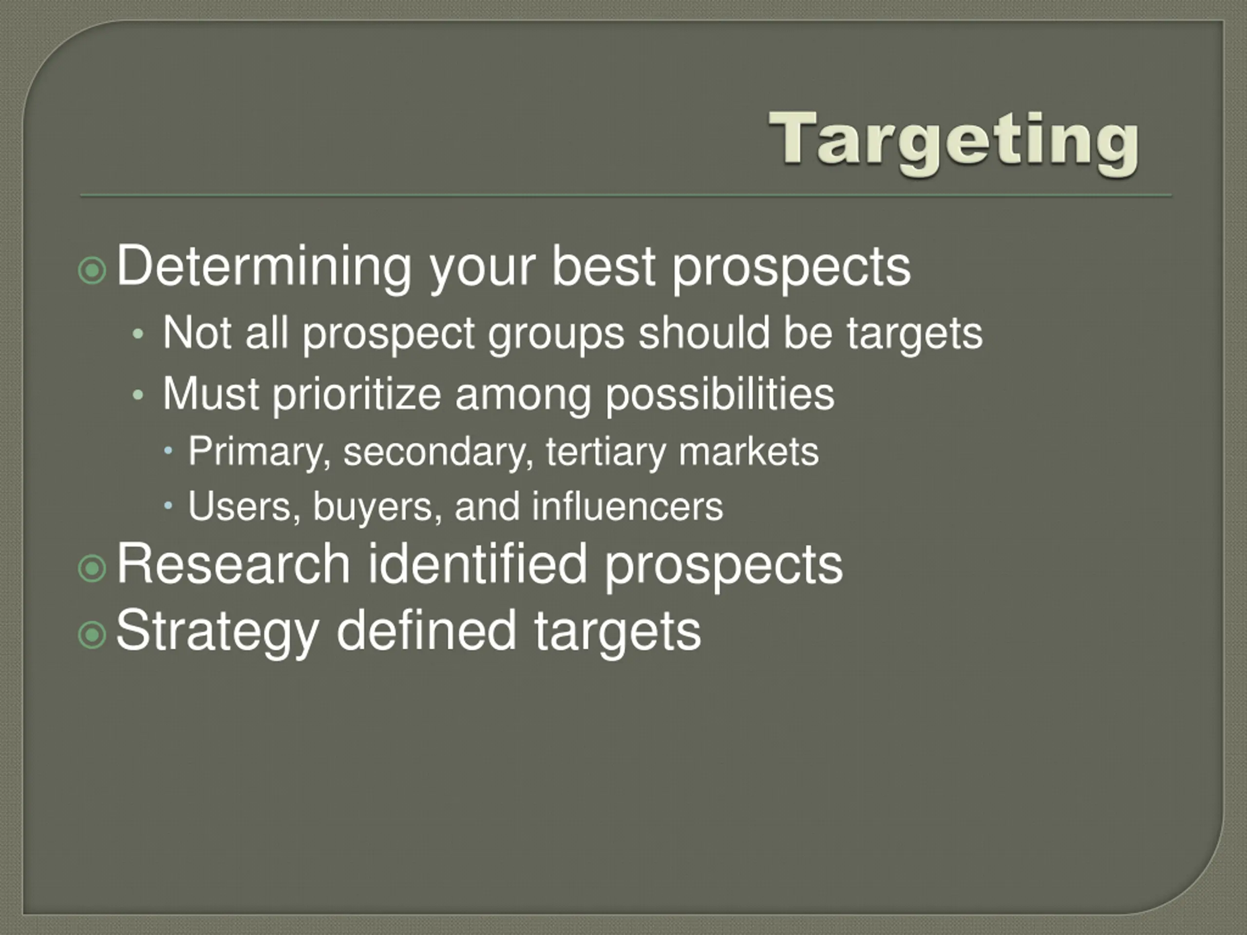 Determining your best prospects Not all prospect groups should be targets Must prioritize among possibilities Primary, secondary, tertiary markets Users, buyers, and influencers Research identified prospects Strategy defined targets