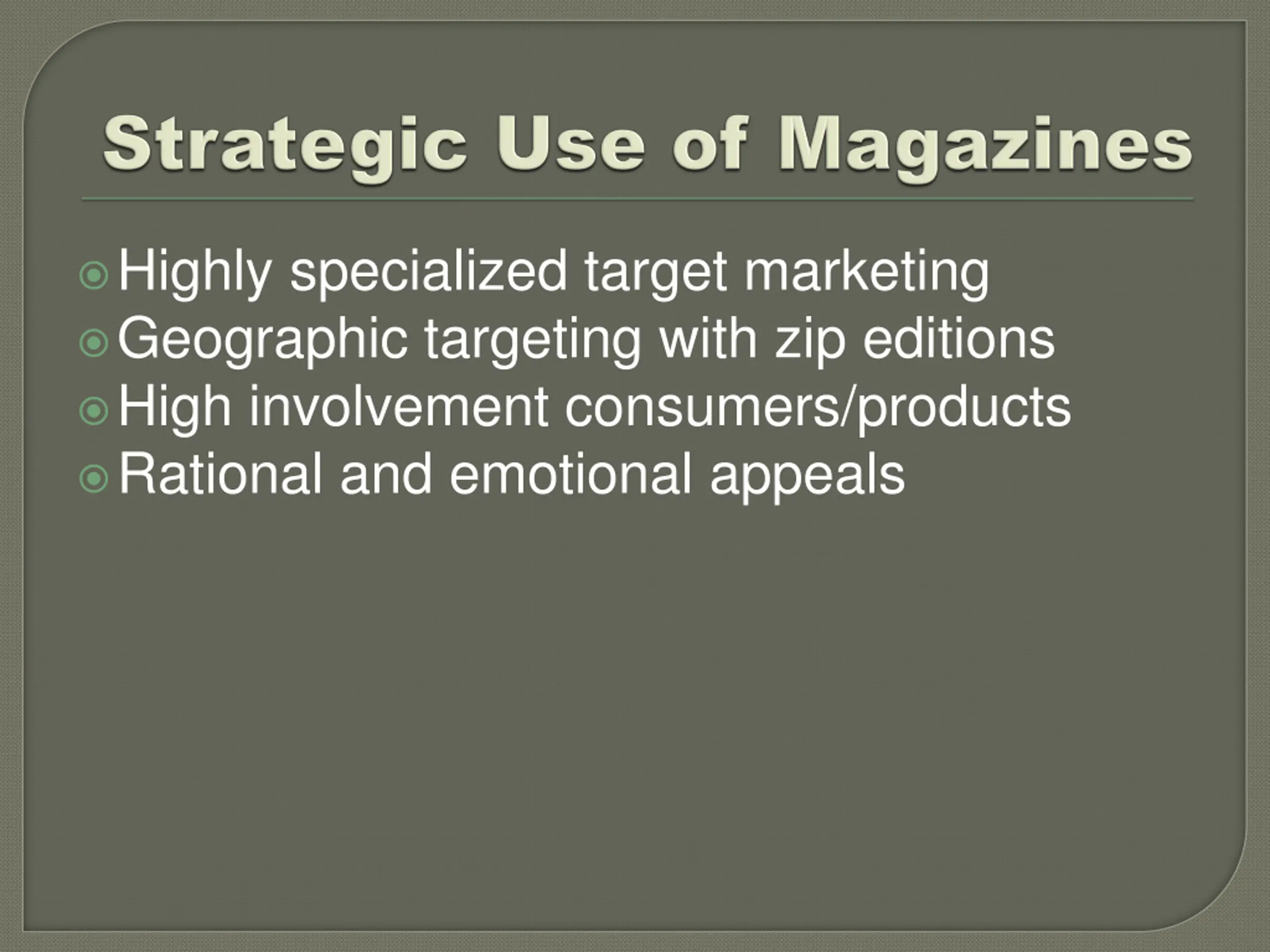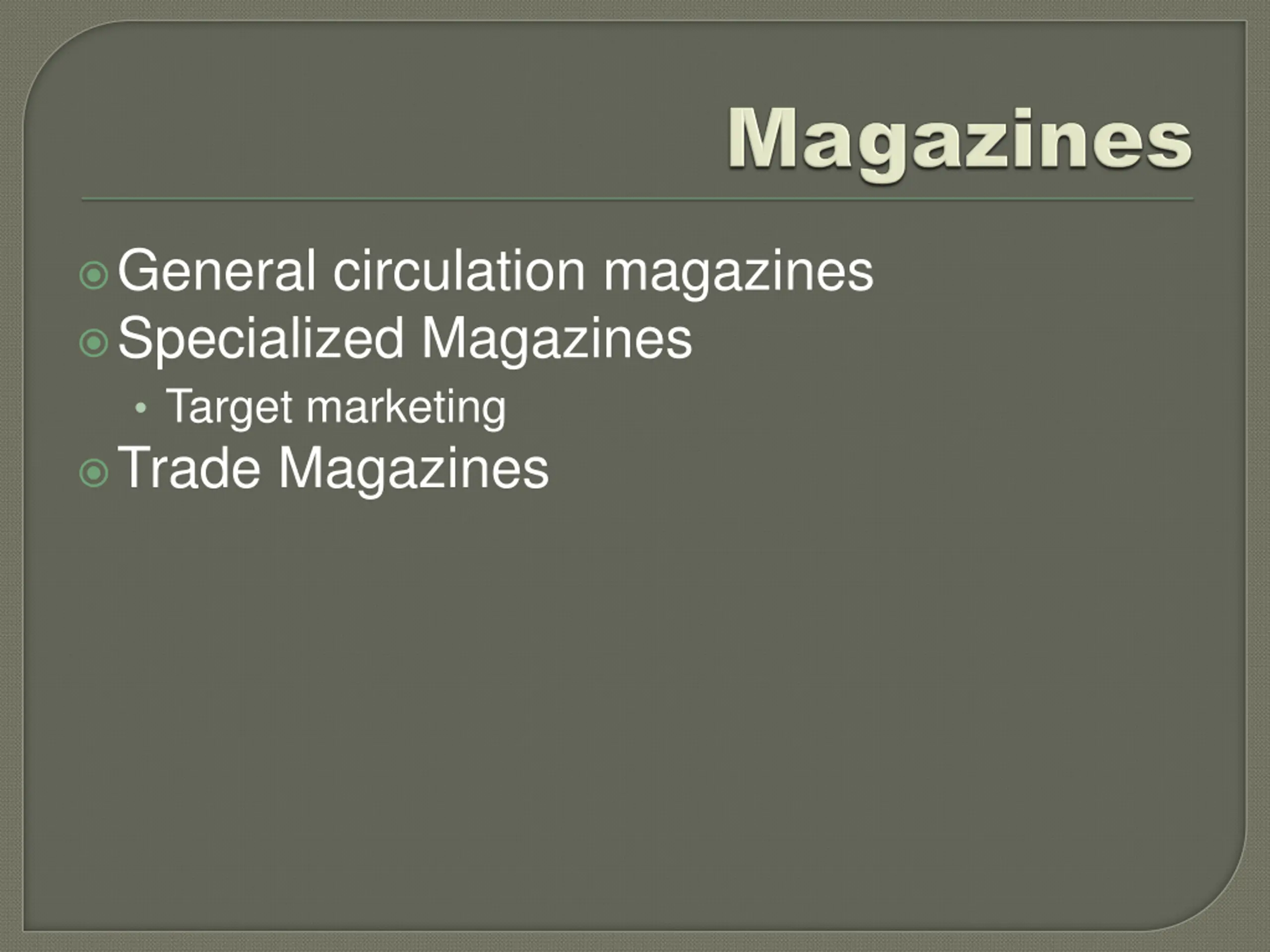 General circulation magazines Specialized Magazines Target marketing Trade Magazines