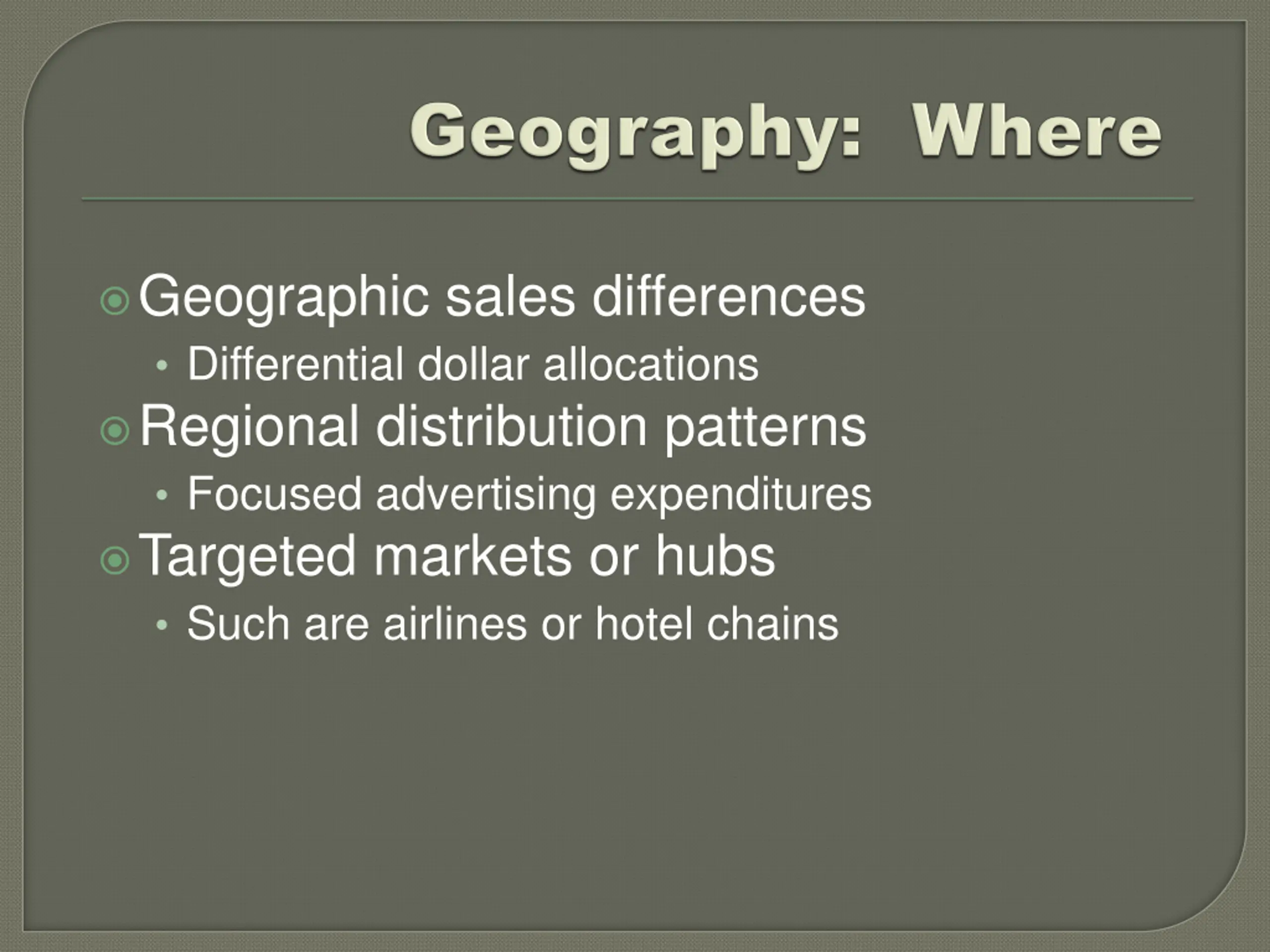 Geographic sales differences Differential dollar allocations Regional distribution patterns Focused advertising expenditures Targeted markets or hubs Such are airlines or hotel chains