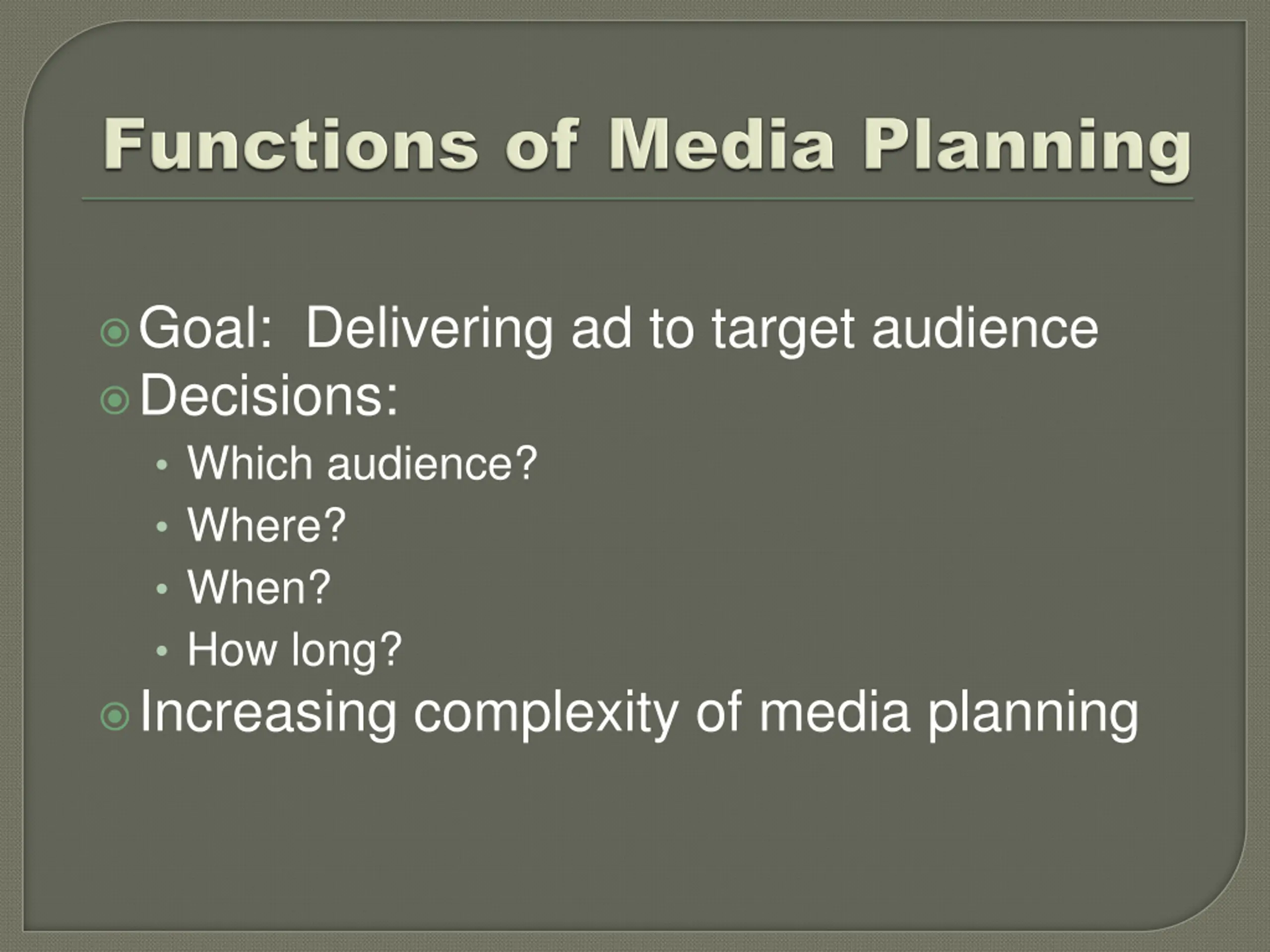 Goal: Delivering ad to target audience Decisions: Which audience? Where? When? How long? Increasing complexity of media planning