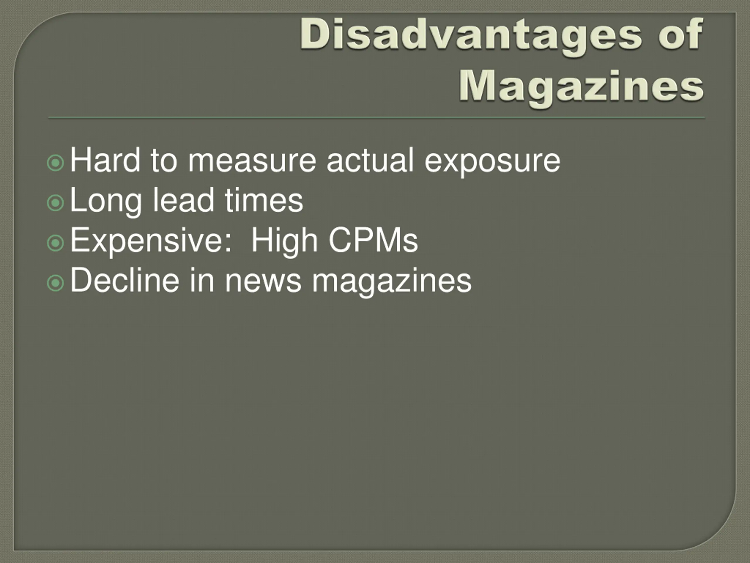 Hard to measure actual exposure Long lead times Expensive: High CPMs Decline in news magazines