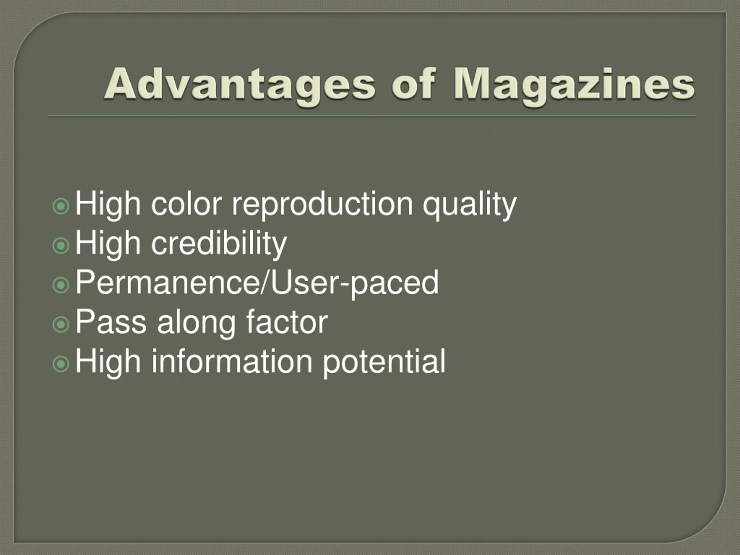 High color reproduction quality High credibility Permanence/User-paced Pass along factor High information potential