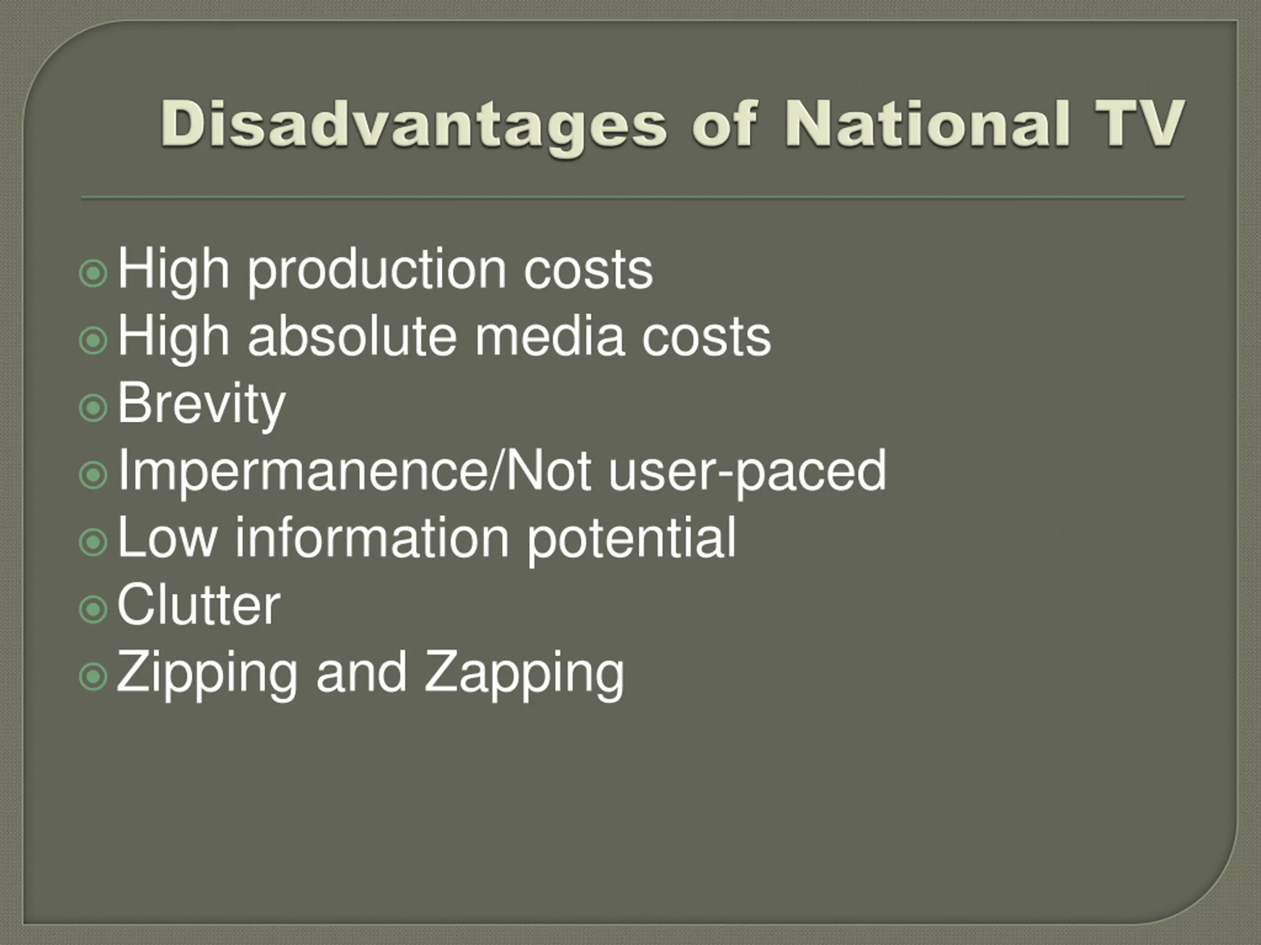 High production costs High absolute media costs Brevity Impermanence/Not user-paced Low information potential Clutter Zipping and Zapping