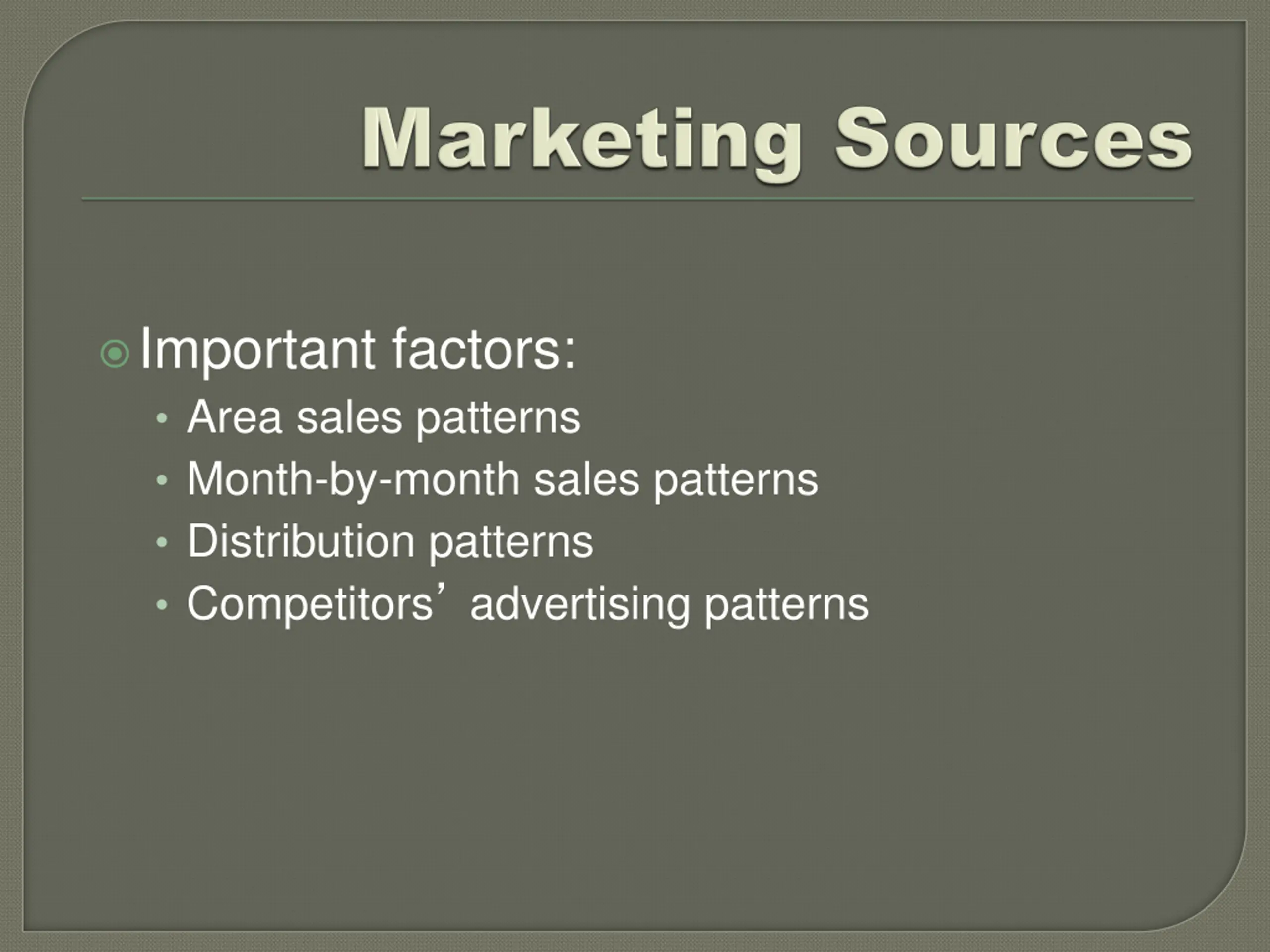 Important factors: Area sales patterns Month-by-month sales patterns Distribution patterns Competitors advertising patterns