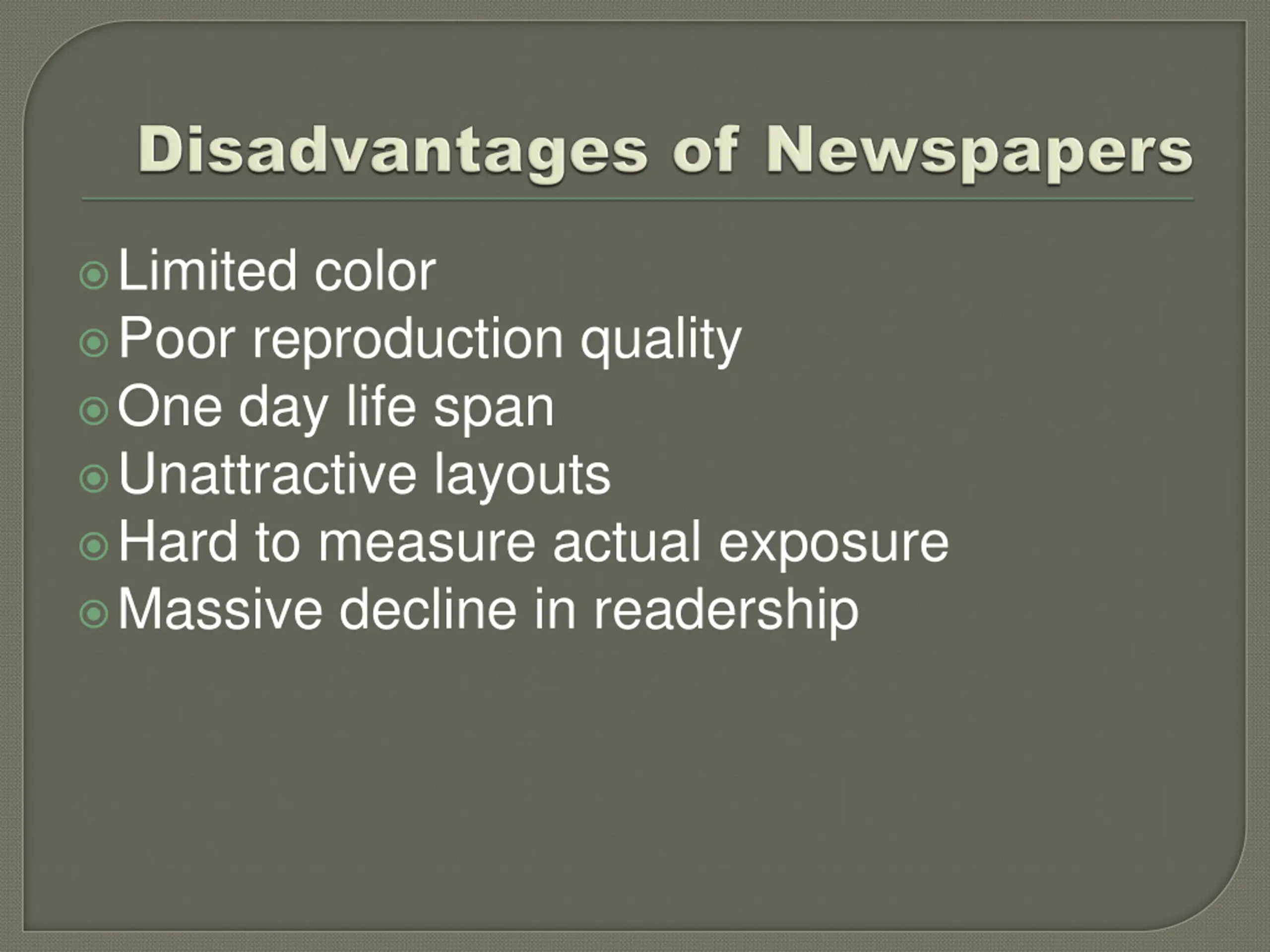 Limited color Poor reproduction quality One day life span Unattractive layouts Hard to measure actual exposure Massive decline in readership