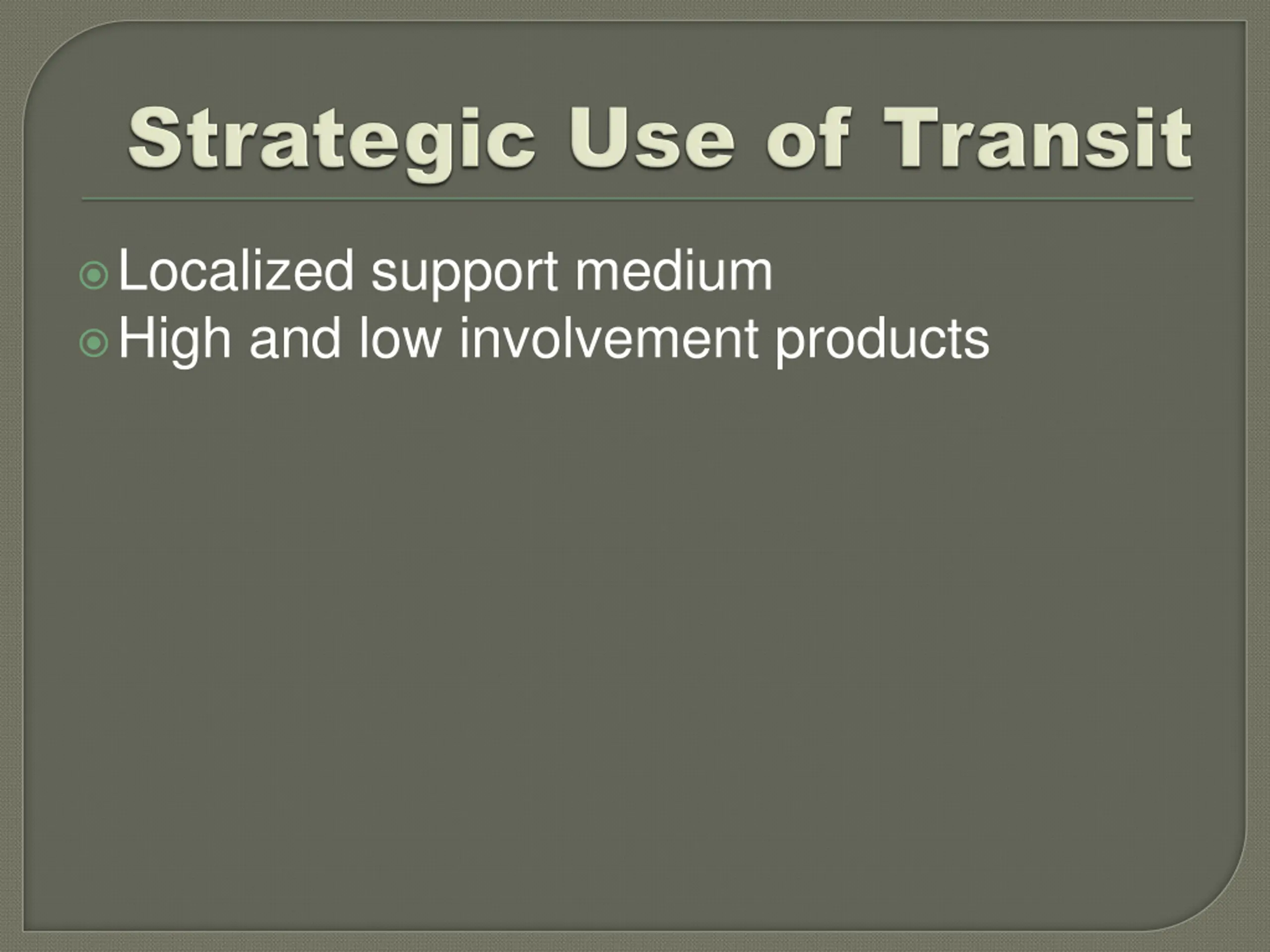 Good coverage medium Localized support medium Low involvement products