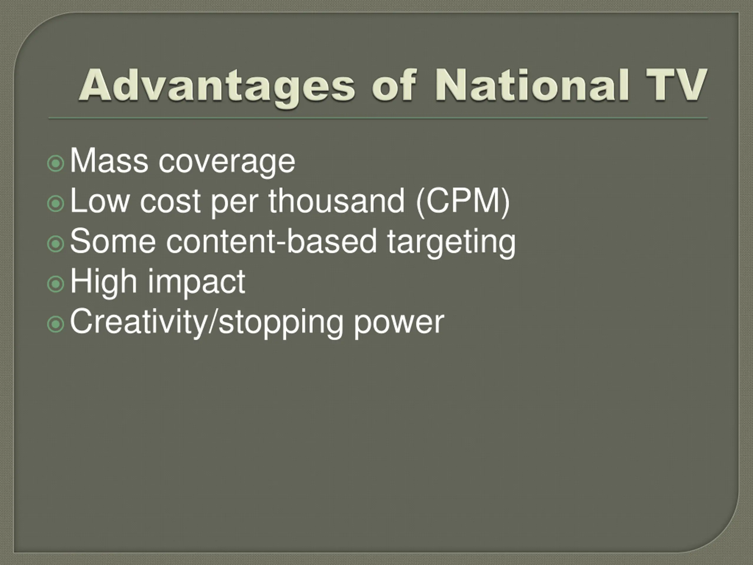 Mass coverage Low cost per thousand (CPM) Some content-based targeting High impact Creativity/stopping power