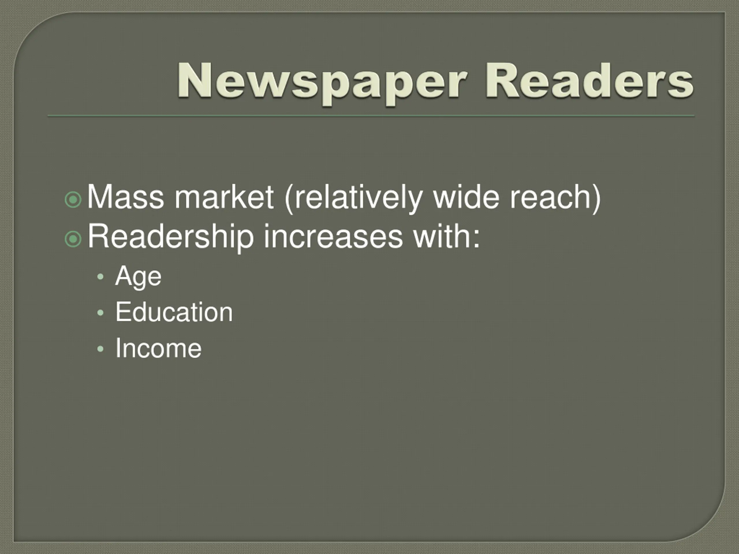 Mass market (relatively wide reach) Readership increases with: Age Education Income
