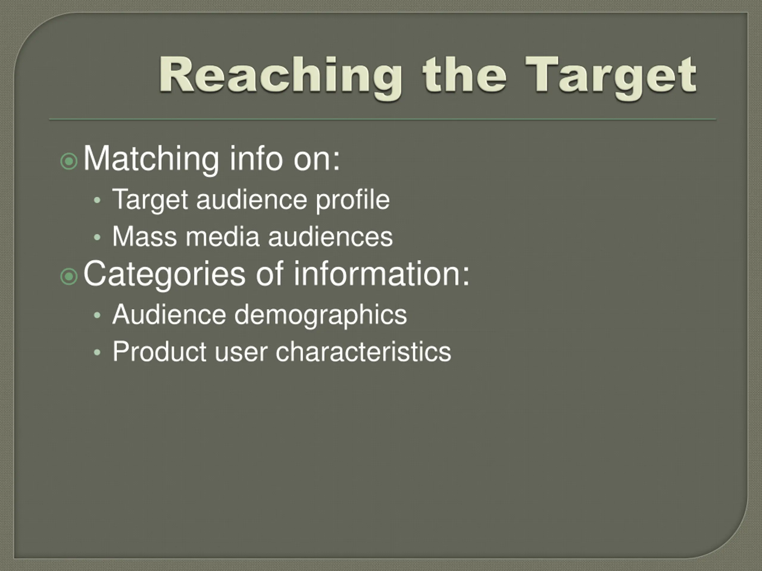 Matching info on: Target audience profile Mass media audiences Categories of information: Audience demographics Product user characteristics