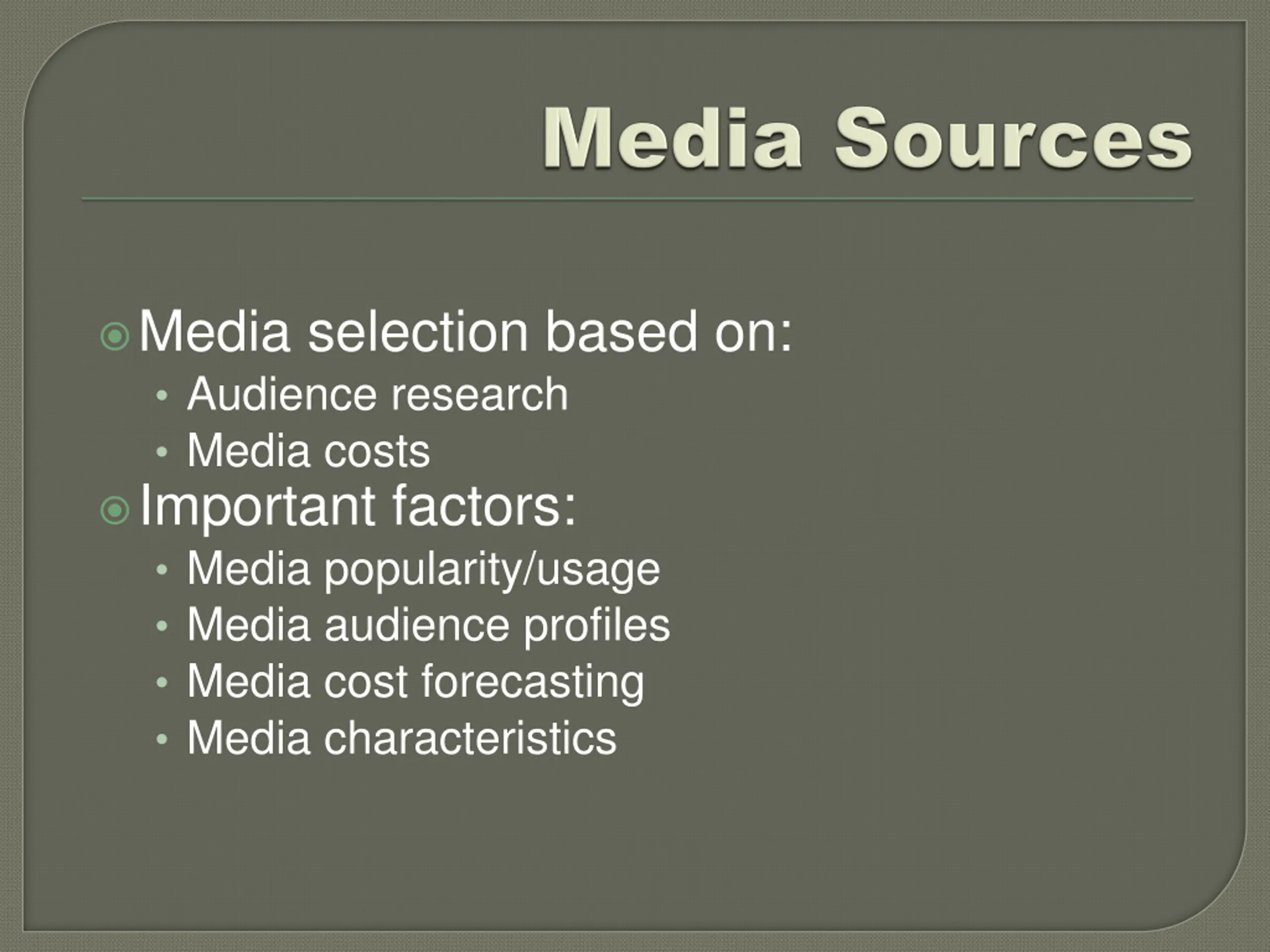 Media selection based on: Audience research Media costs Important factors: Media popularity/usage Media audience profiles Media cost forecasting Media characteristics