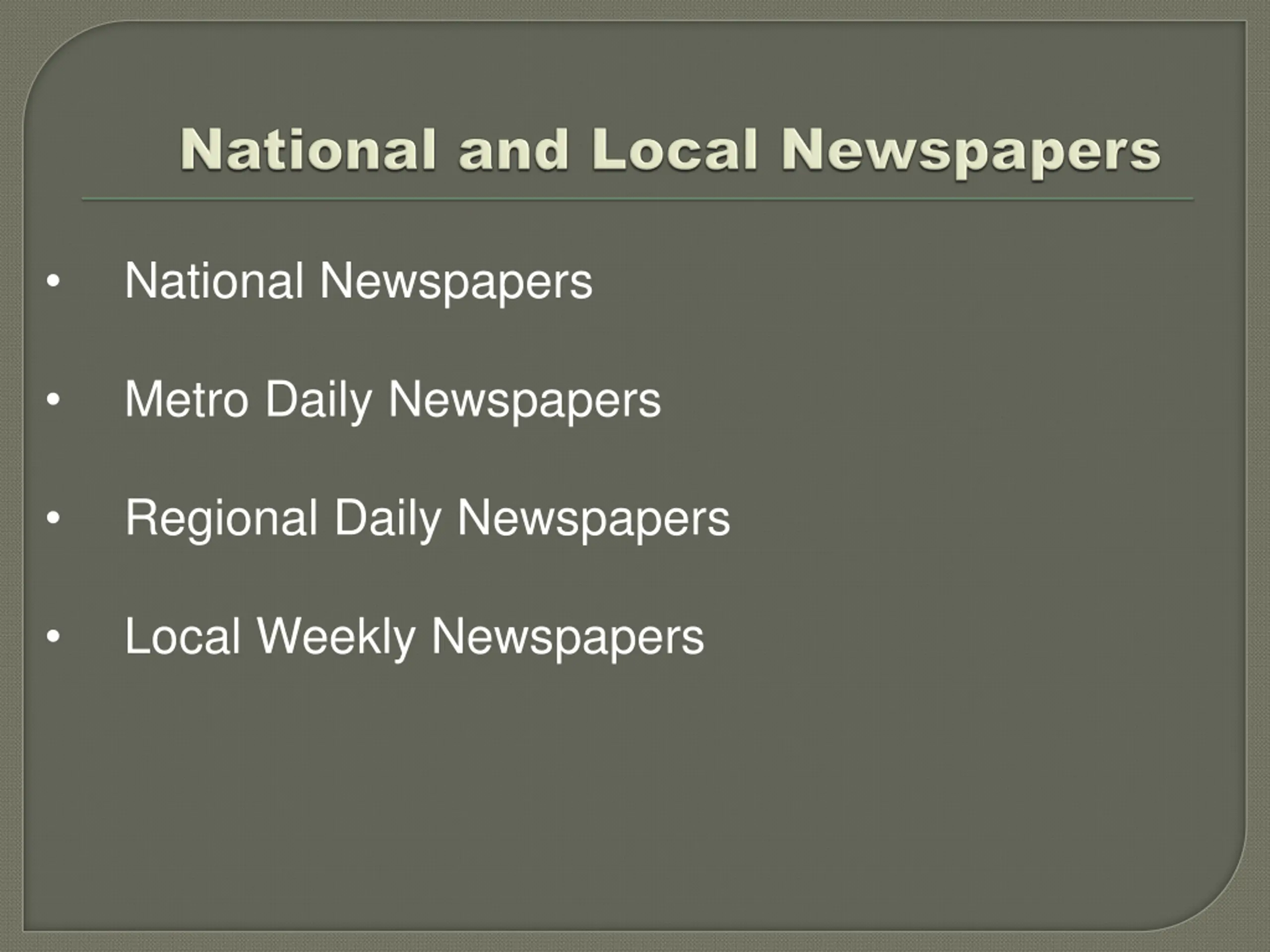 National Newspapers Metro Daily Newspapers Regional Daily Newspapers Local Weekly Newspapers