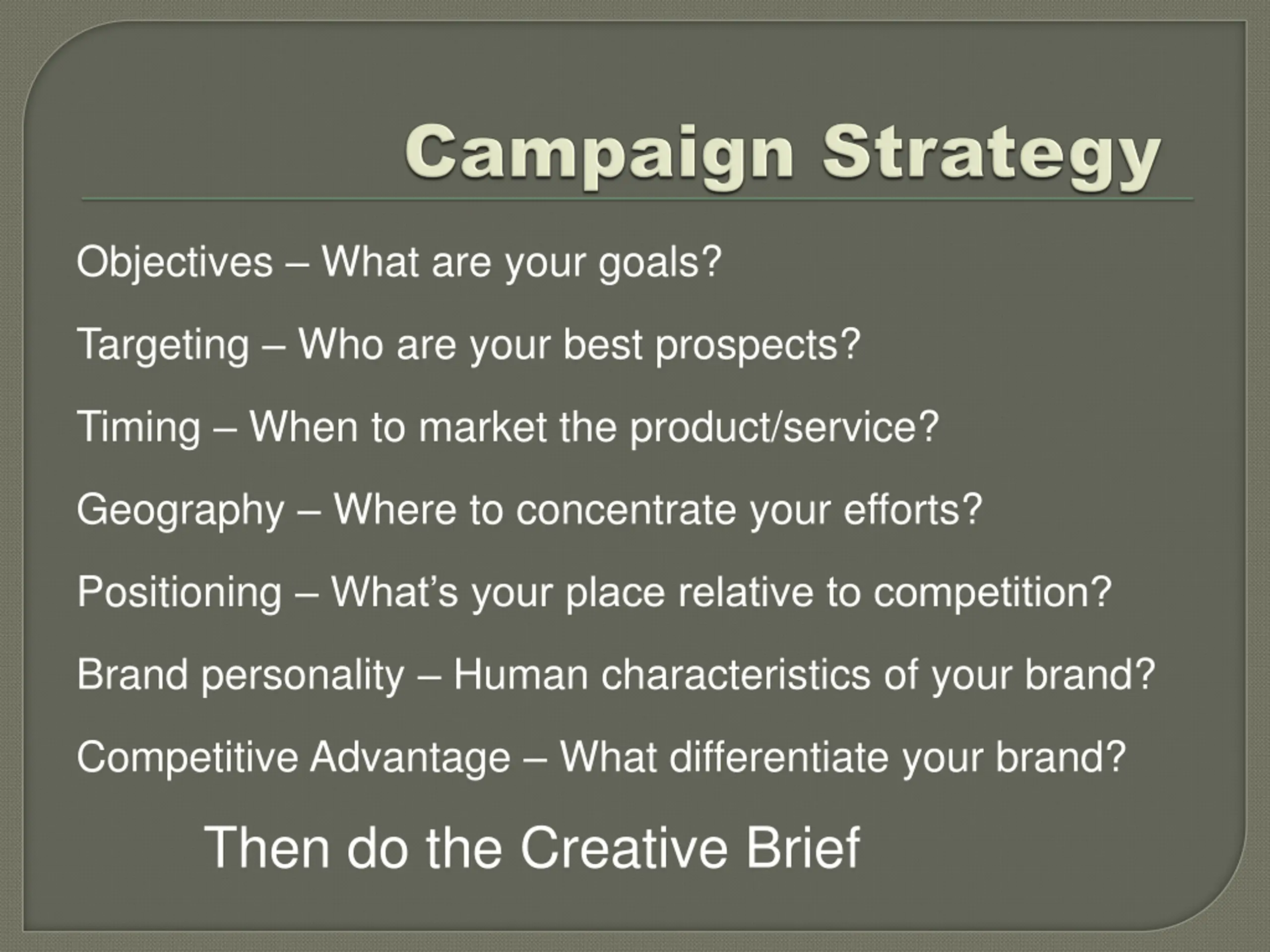 Objectives What are your goals? Targeting Who are your best prospects? Timing When to market the product/service? Geography Where to concentrate your efforts? Positioning What s your place relative to competition? Brand personality Human characteristics of your brand? Competitive Advantage What differentiate your brand? Then do the Creative Brief