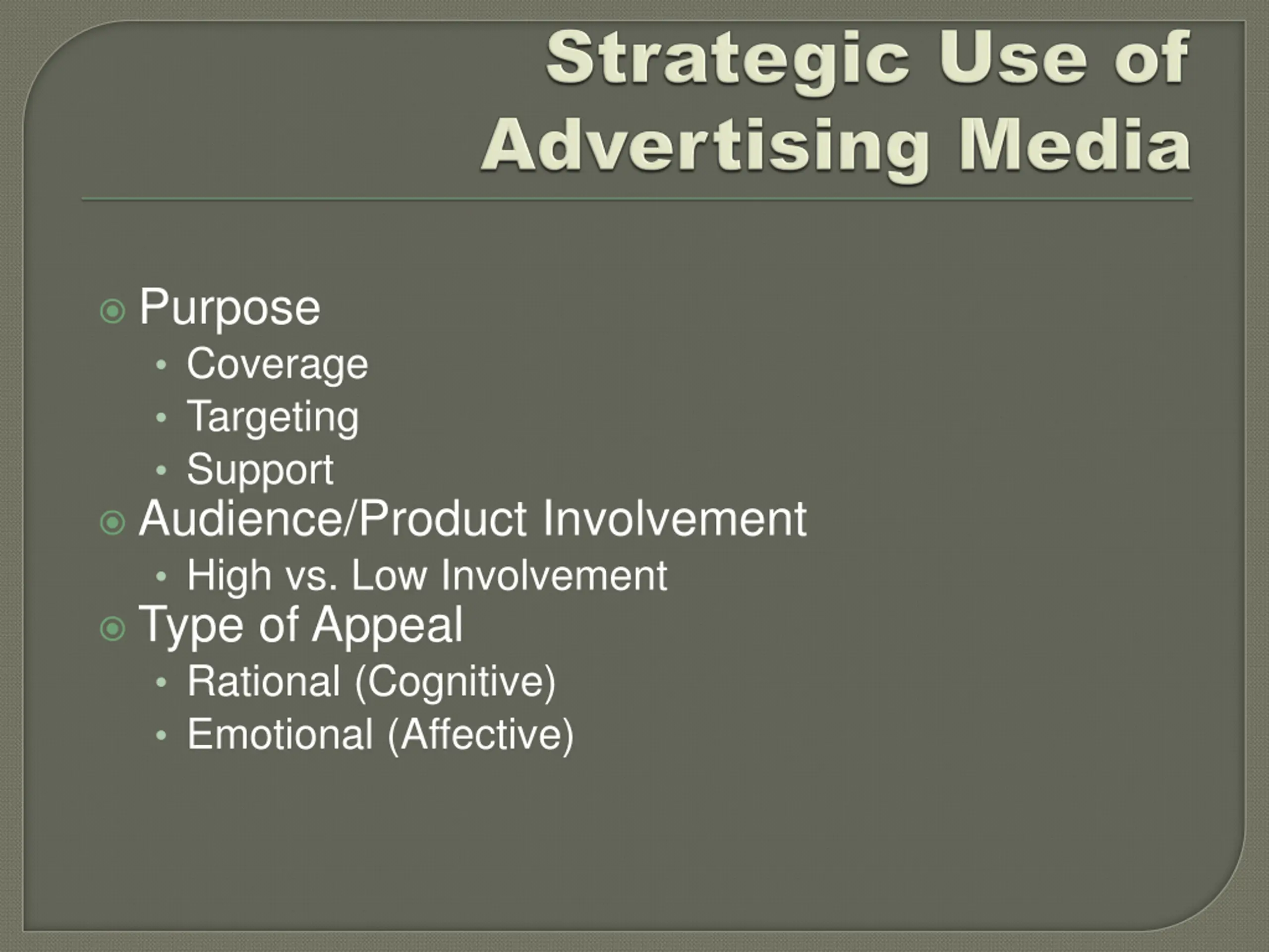 Purpose Coverage Targeting Support Audience/Product Involvement High vs. Low Involvement Type of Appeal Rational (Cognitive) Emotional (Affective)