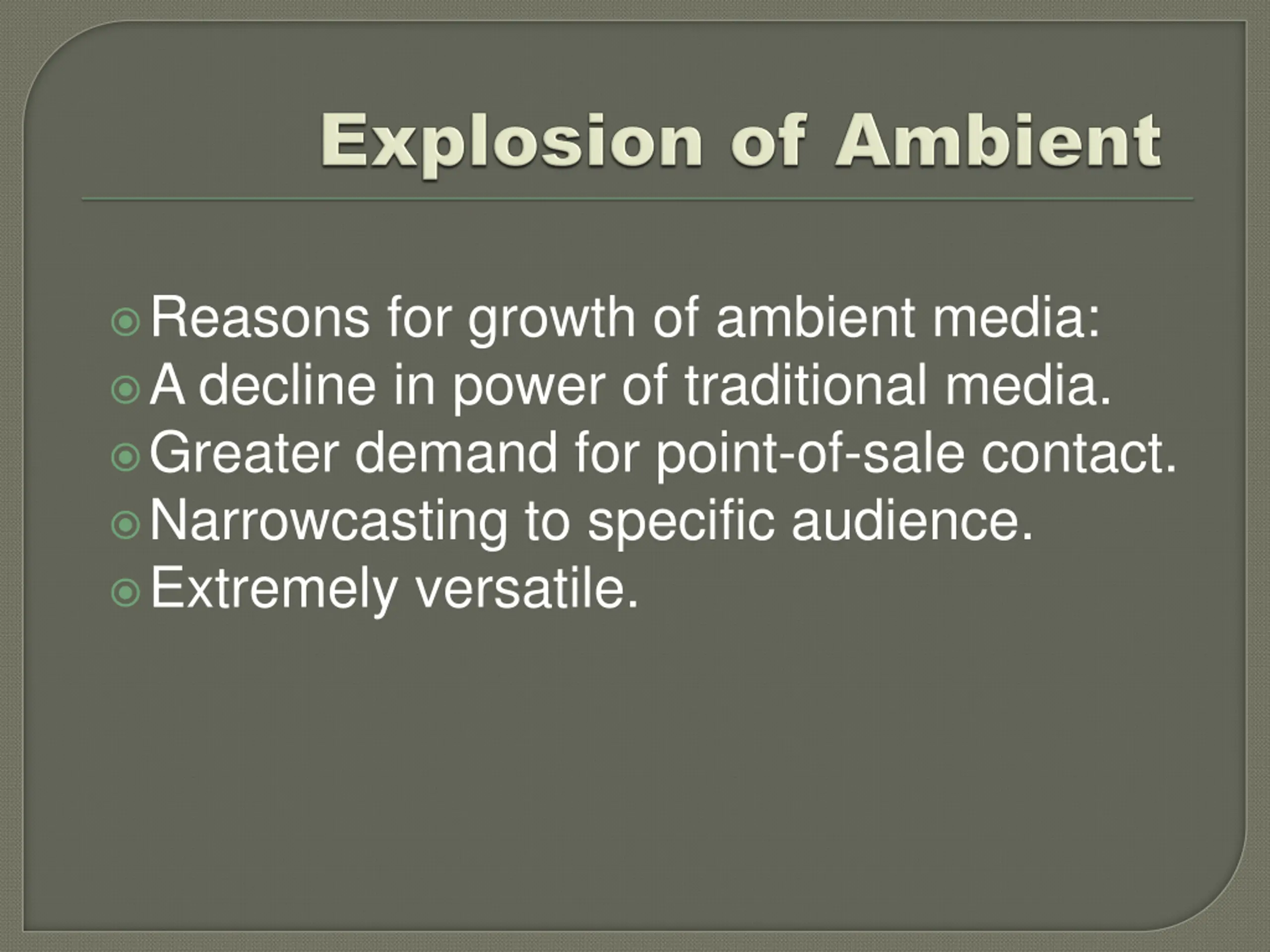 Reasons for growth of ambient media: A decline in power of traditional media. Greater demand for point-of-sale contact. Narrowcasting to specific audience. Extremely versatile.