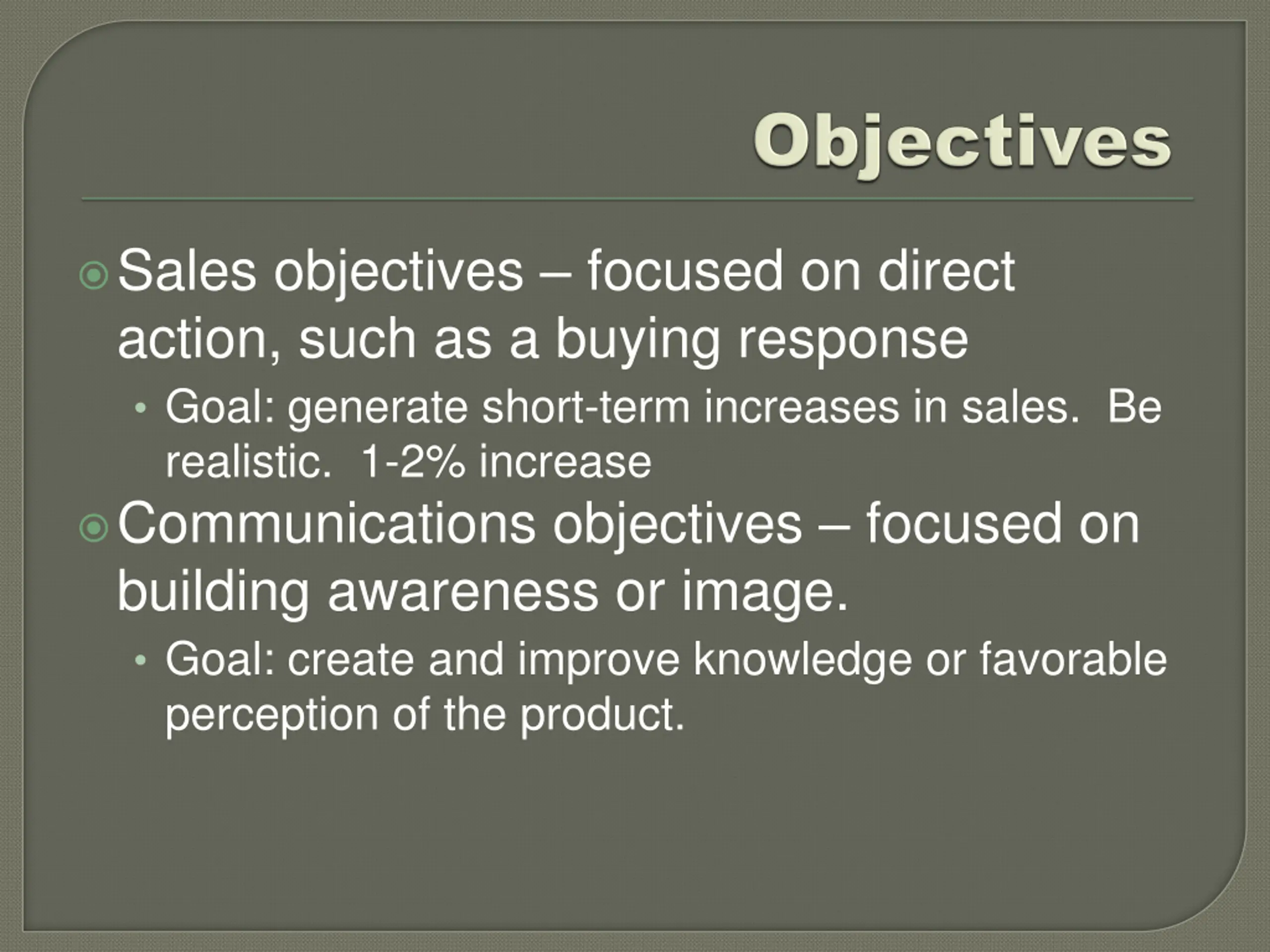 Sales objectives focused on direct action, such as a buying response Goal: generate short-term increases in sales. Be realistic. 1-2% increase Communications objectives focused on building awareness or image. Goal: create and improve knowledge or favorable perception of the product.