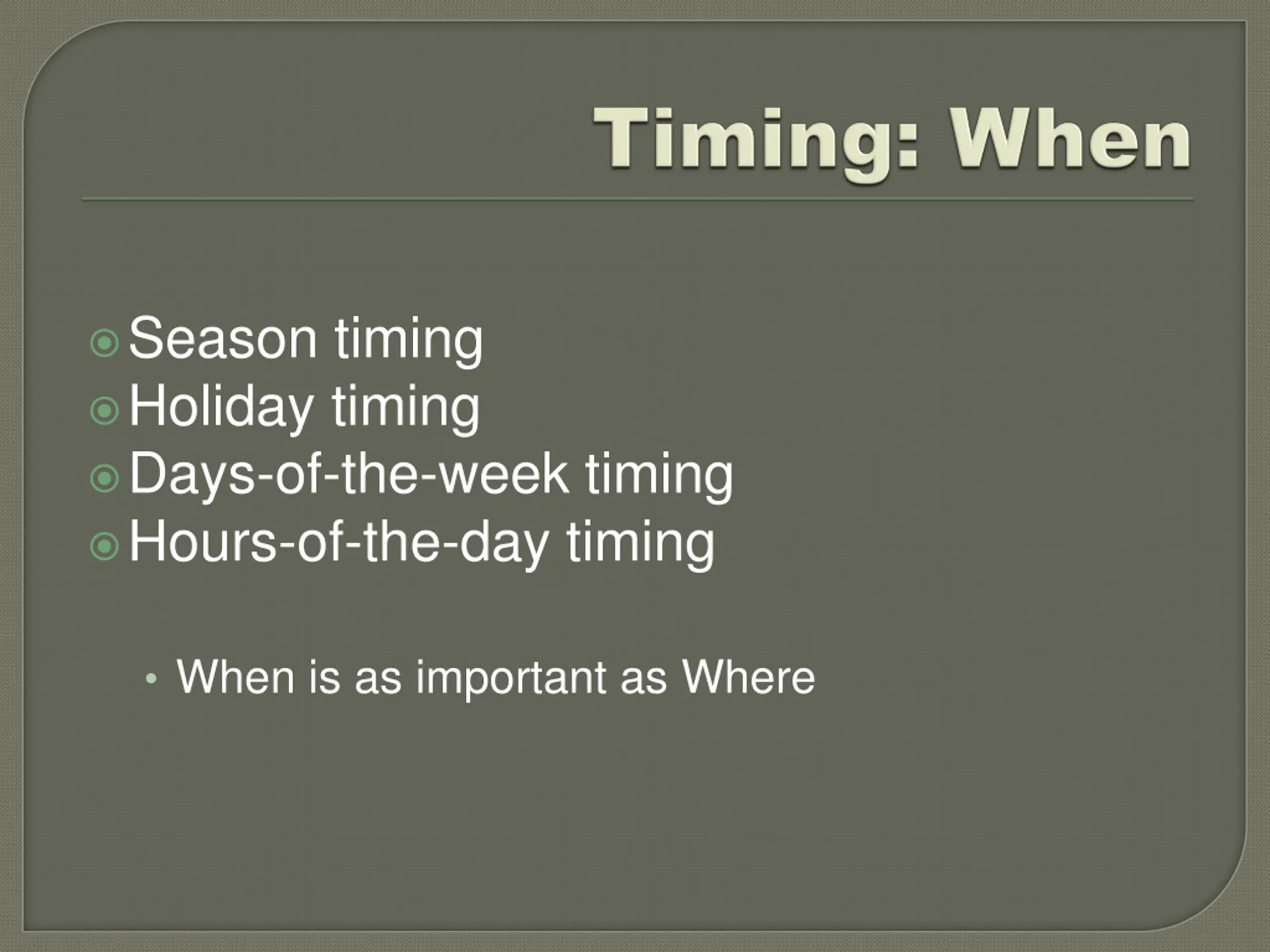 Season timing Holiday timing Days-of-the-week timing Hours-of-the-day timing When is as important as Where