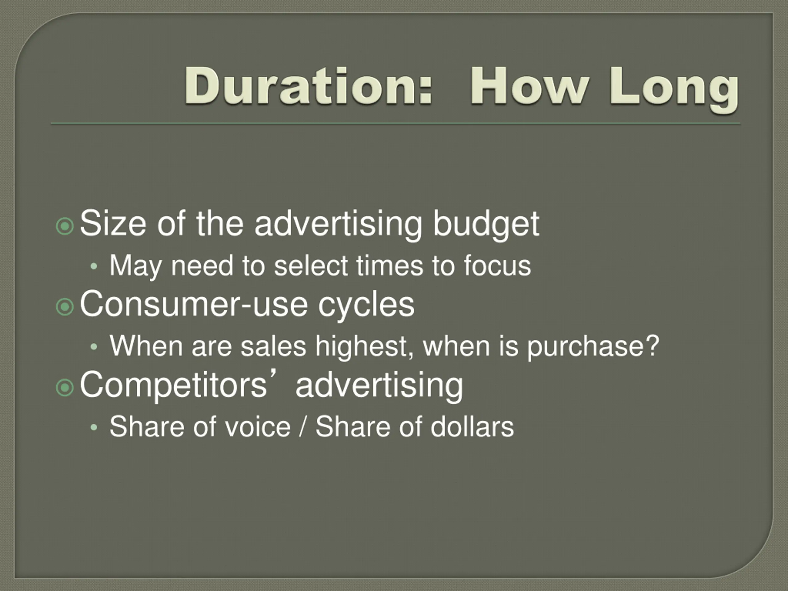 Size of the advertising budget May need to select times to focus Consumer-use cycles When are sales highest, when is purchase? Competitors advertising Share of voice / Share of dollars