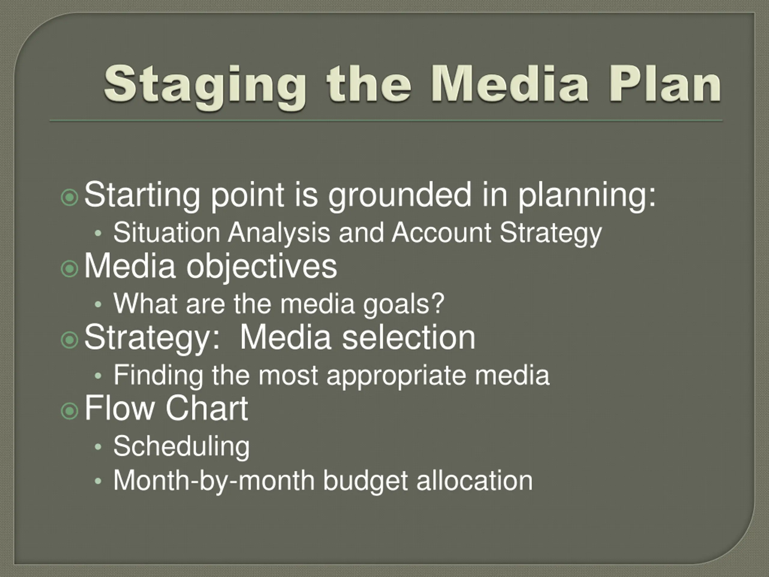 Starting point is grounded in planning: Situation Analysis and Account Strategy Media objectives What are the media goals? Strategy: Media selection Finding the most appropriate media Flow Chart Scheduling Month-by-month budget allocation
