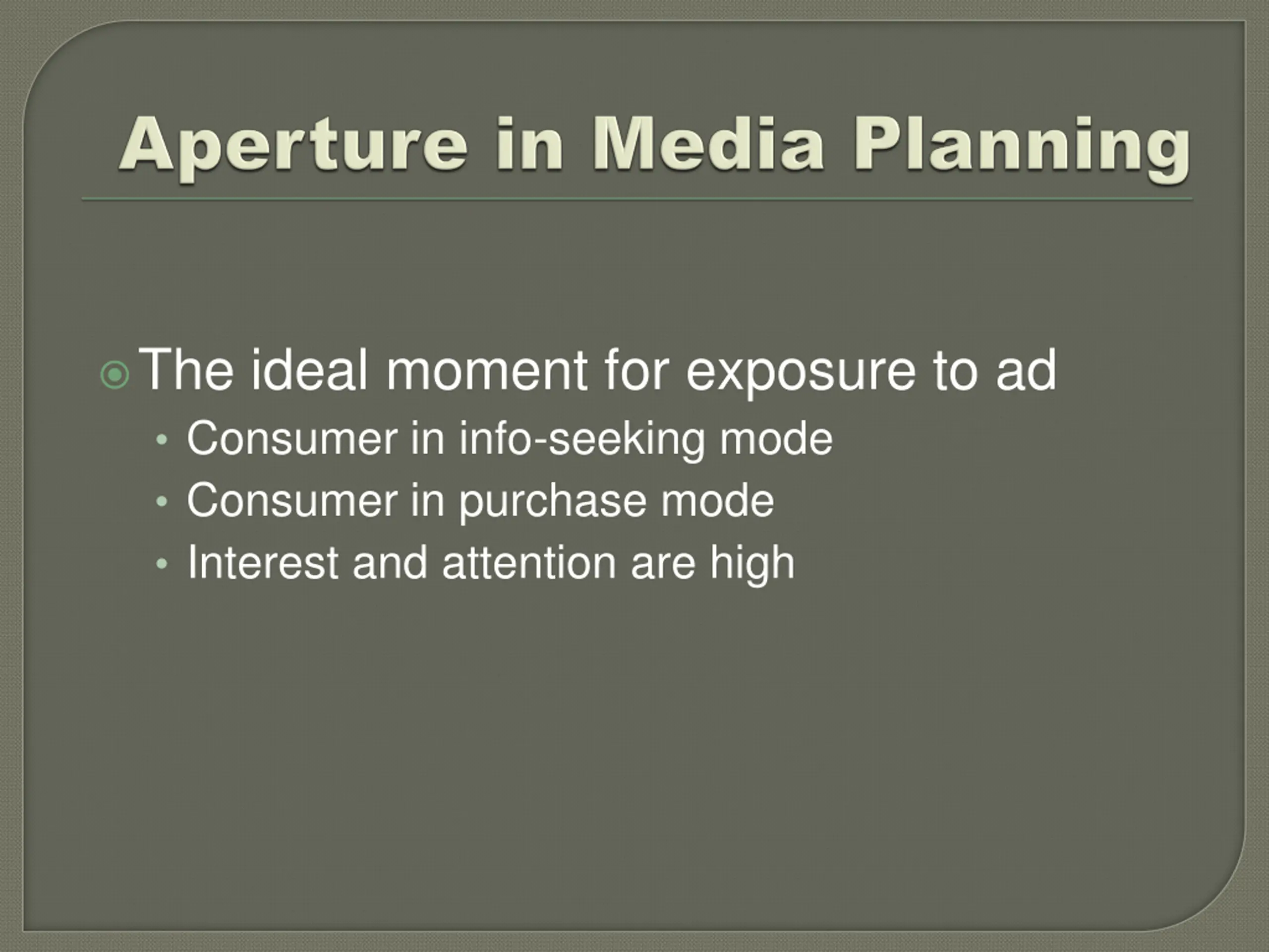 The ideal moment for exposure to ad Consumer in info-seeking mode Consumer in purchase mode Interest and attention are high