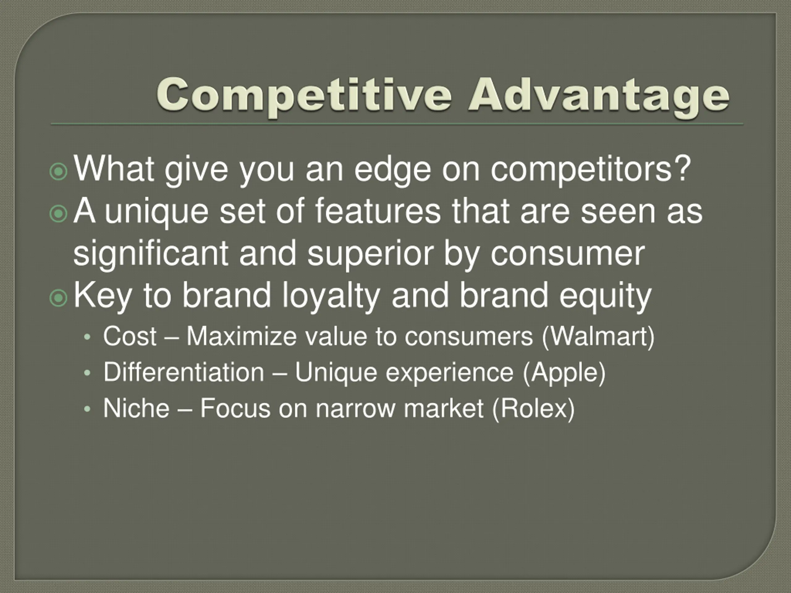 What give you an edge on competitors? A unique set of features that are seen as significant and superior by consumer Key to brand loyalty and brand equity Cost Maximize value to consumers (Walmart) Differentiation Unique experience (Apple) Niche Focus on narrow market (Rolex)