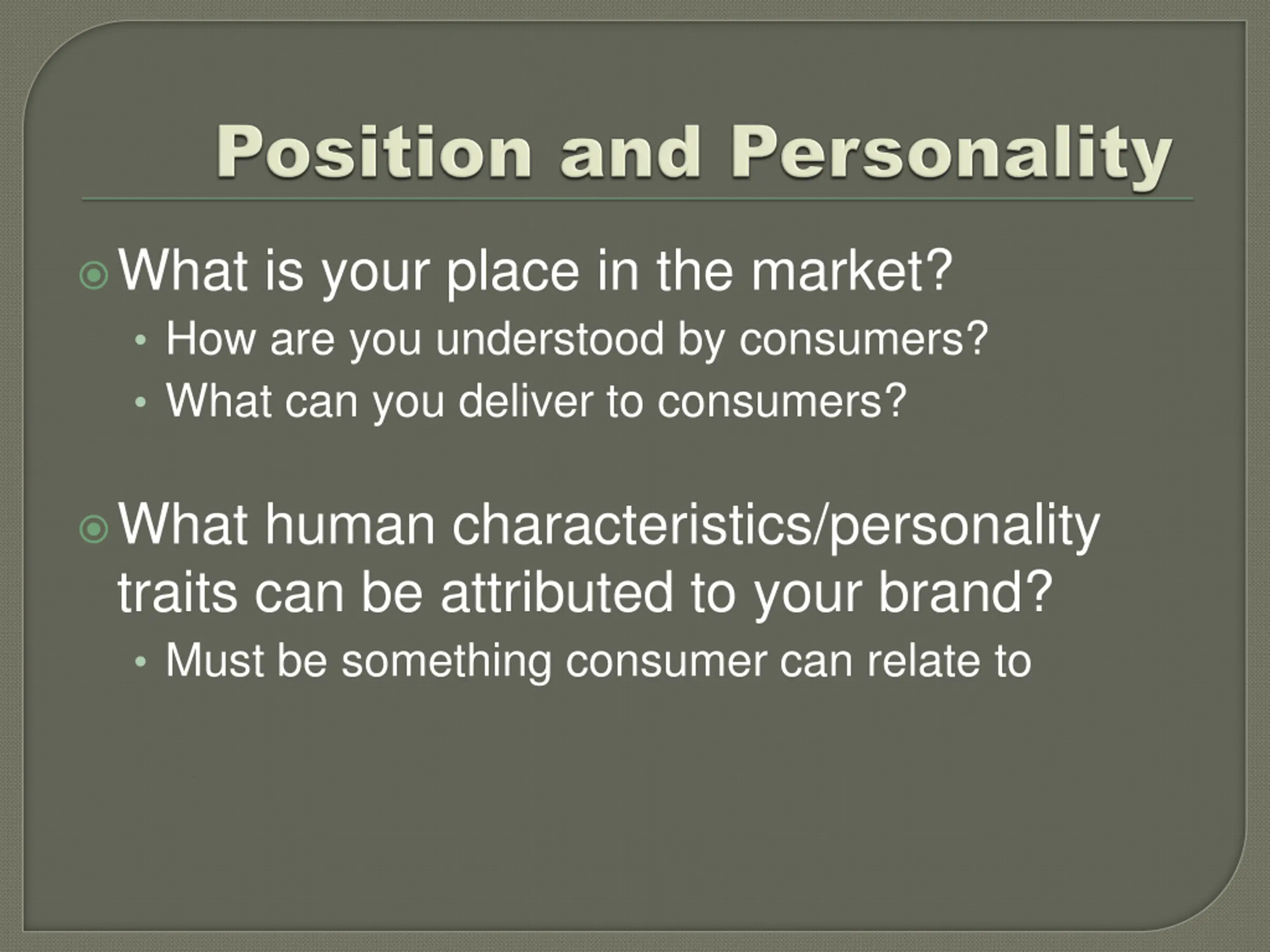 What is your place in the market? How are you understood by consumers? What can you deliver to consumers? What human characteristics/personality traits can be attributed to your brand? Must be something consumer can relate to