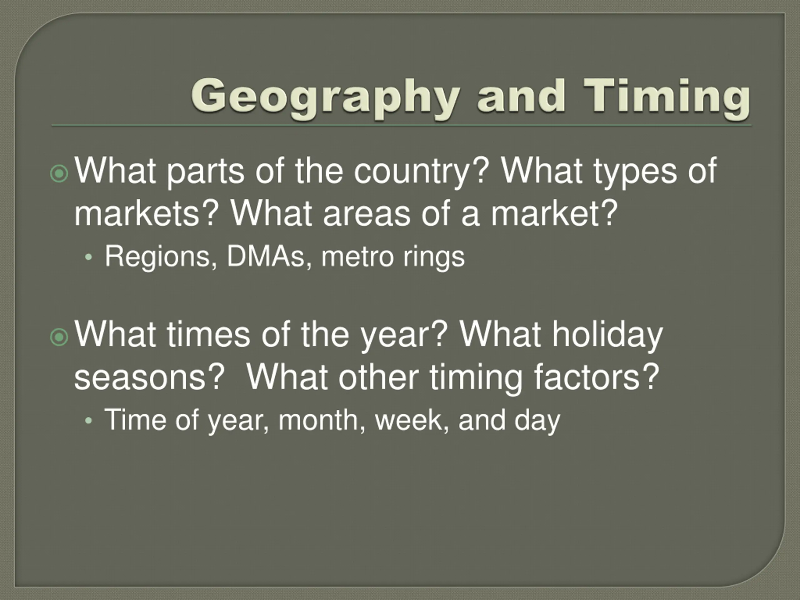 What parts of the country? What types of markets? What areas of a market? Regions, DMAs, metro rings What times of the year? What holiday seasons? What other timing factors? Time of year, month, week, and day
