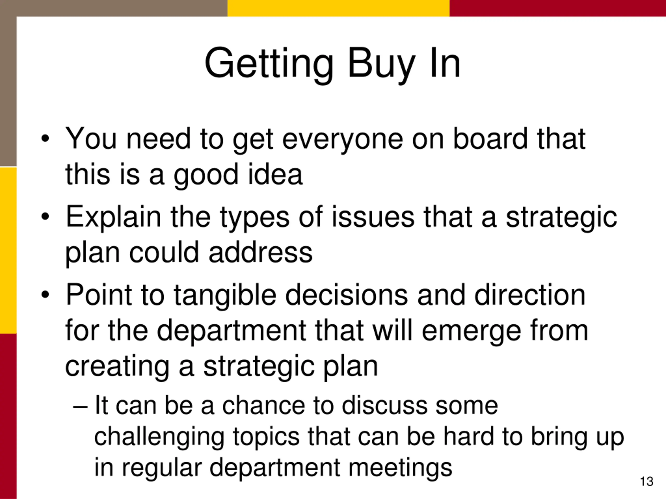 Getting Buy In You need to get everyone on board that this is a good idea Explain the types of issues that a strategic plan could address Point to tangible decisions and direction for the department that will emerge from creating a strategic plan It can be a chance to discuss some challenging topics that can be hard to bring up in regular department meetings 13