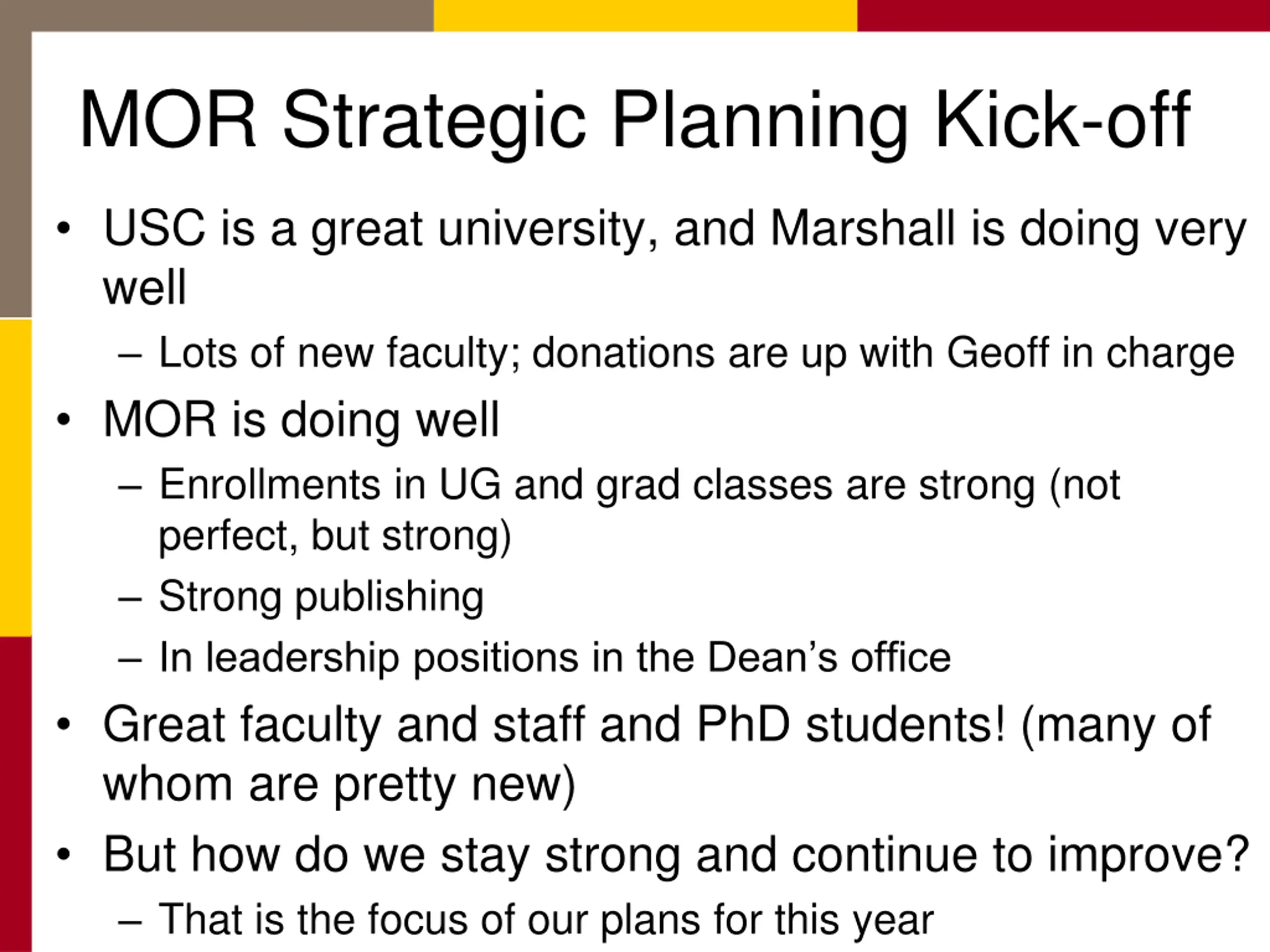 MOR Strategic Planning Kick-off USC is a great university, and Marshall is doing very well Lots of new faculty; donations are up with Geoff in charge MOR is doing well Enrollments in UG and grad classes are strong (not perfect, but strong) Strong publishing In leadership positions in the Dean s office Great faculty and staff and PhD students! (many of whom are pretty new) But how do we stay strong and continue to improve? That is the focus of our plans for this year