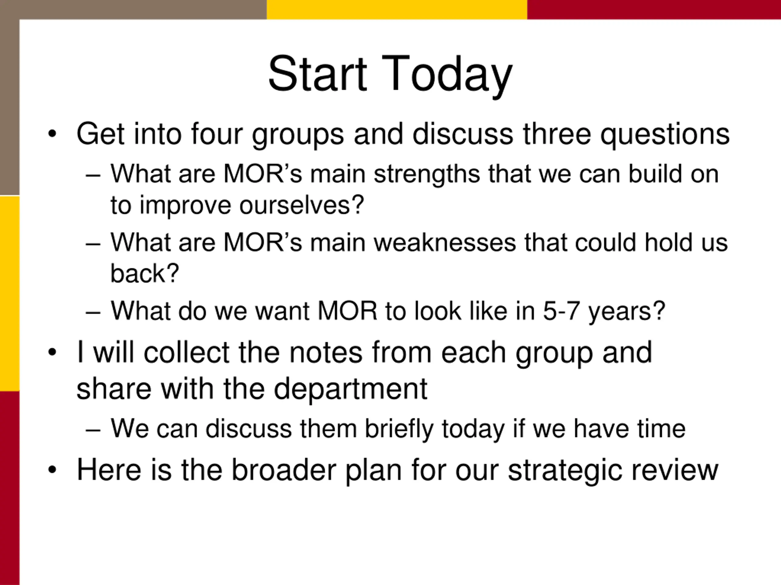 Start Today Get into four groups and discuss three questions What are MOR s main strengths that we can build on to improve ourselves? What are MOR s main weaknesses that could hold us back? What do we want MOR to look like in 5-7 years? I will collect the notes from each group and share with the department We can discuss them briefly today if we have time Here is the broader plan for our strategic review