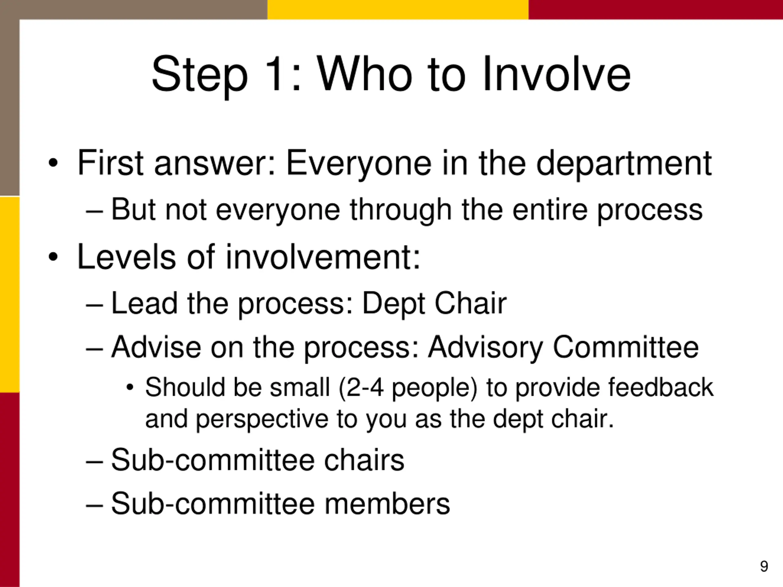 Step 1: Who to Involve First answer: Everyone in the department But not everyone through the entire process Levels of involvement: Lead the process: Dept Chair Advise on the process: Advisory Committee Should be small (2-4 people) to provide feedback and perspective to you as the dept chair. Sub-committee chairs Sub-committee members 9