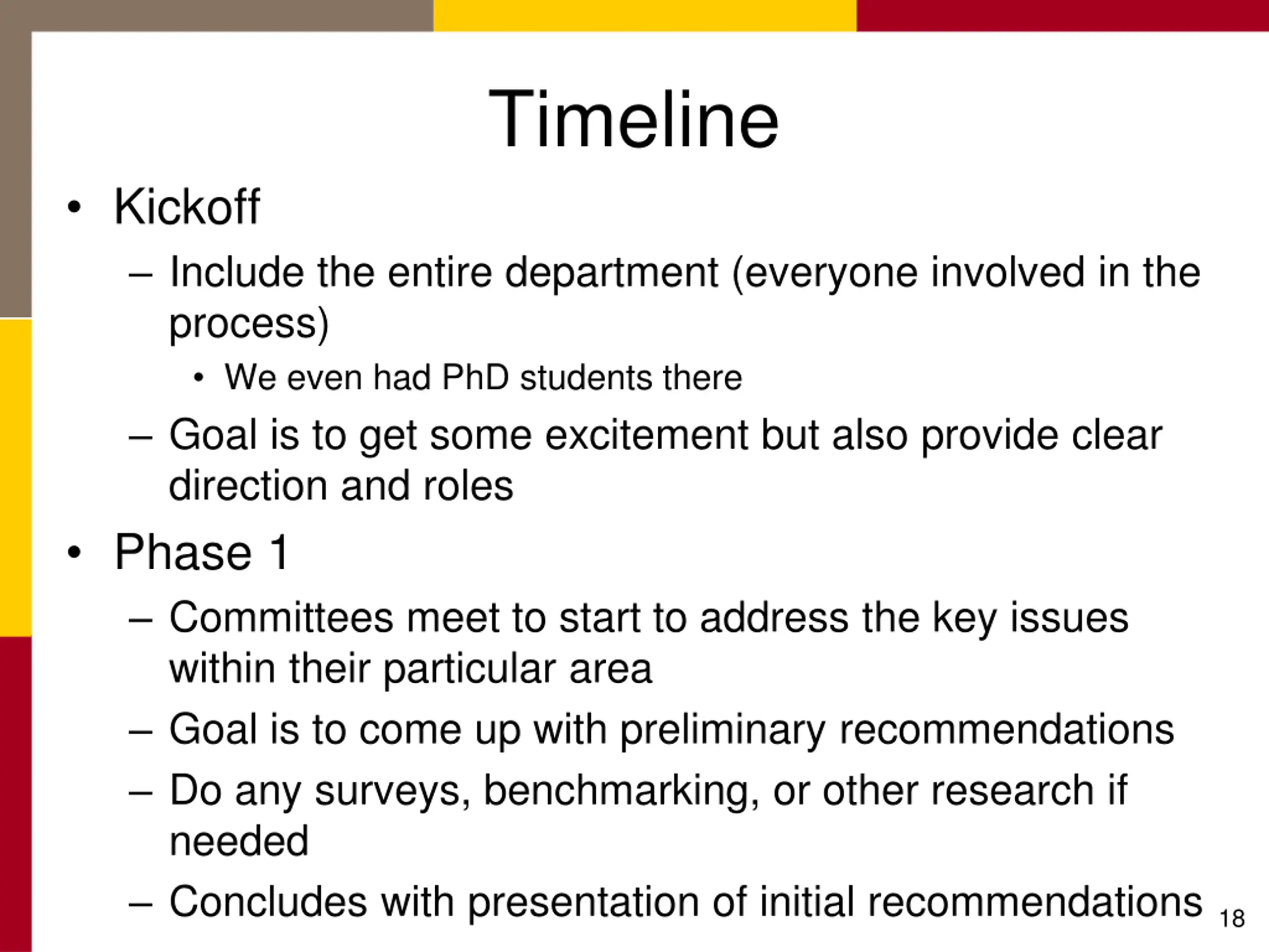 Timeline Kickoff Include the entire department (everyone involved in the process) We even had PhD students there Goal is to get some excitement but also provide clear direction and roles Phase 1 Committees meet to start to address the key issues within their particular area Goal is to come up with preliminary recommendations Do any surveys, benchmarking, or other research if needed Concludes with presentation of initial recommendations18