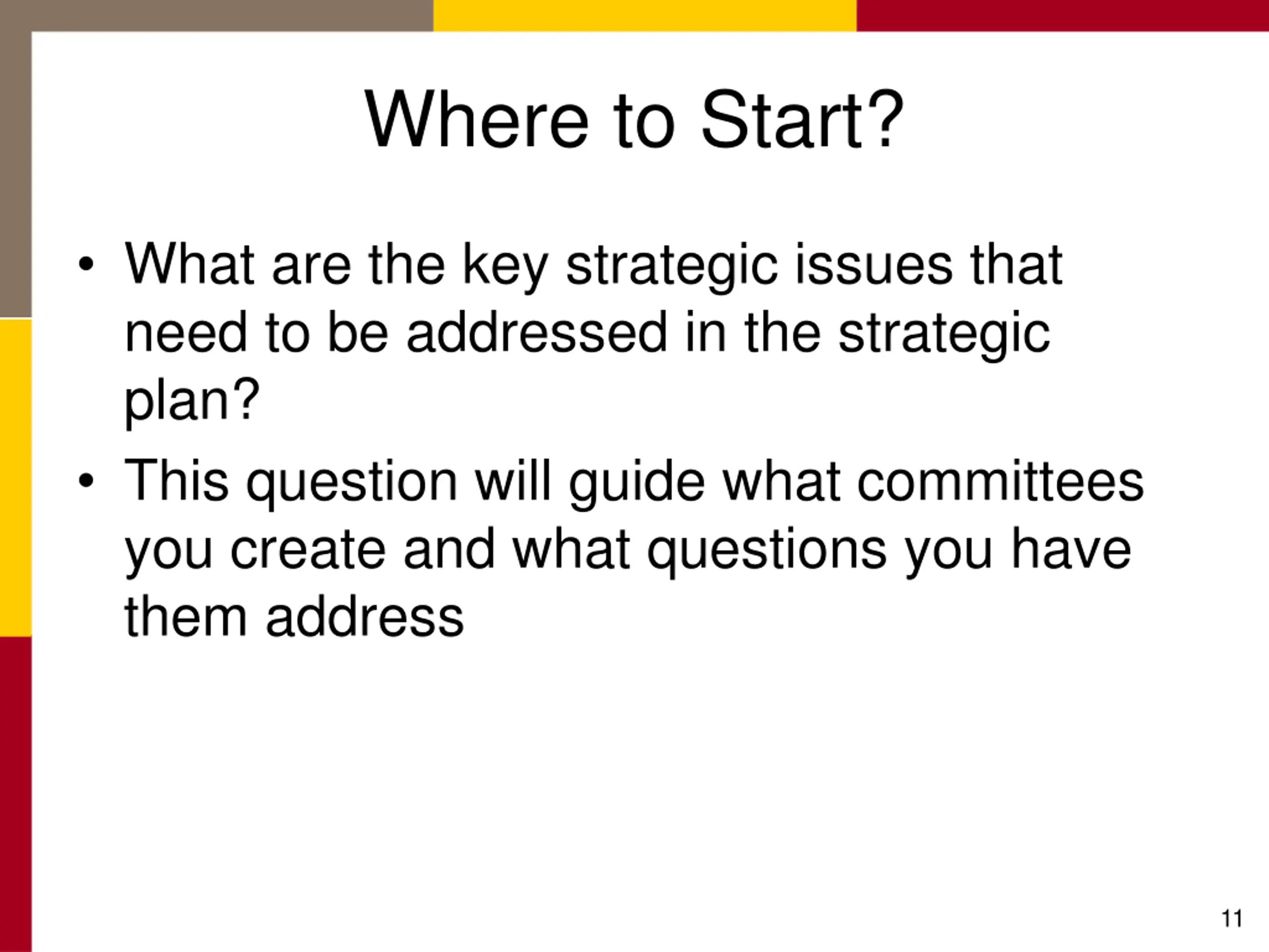 Where to Start? What are the key strategic issues that need to be addressed in the strategic plan? This question will guide what committees you create and what questions you have them address 11