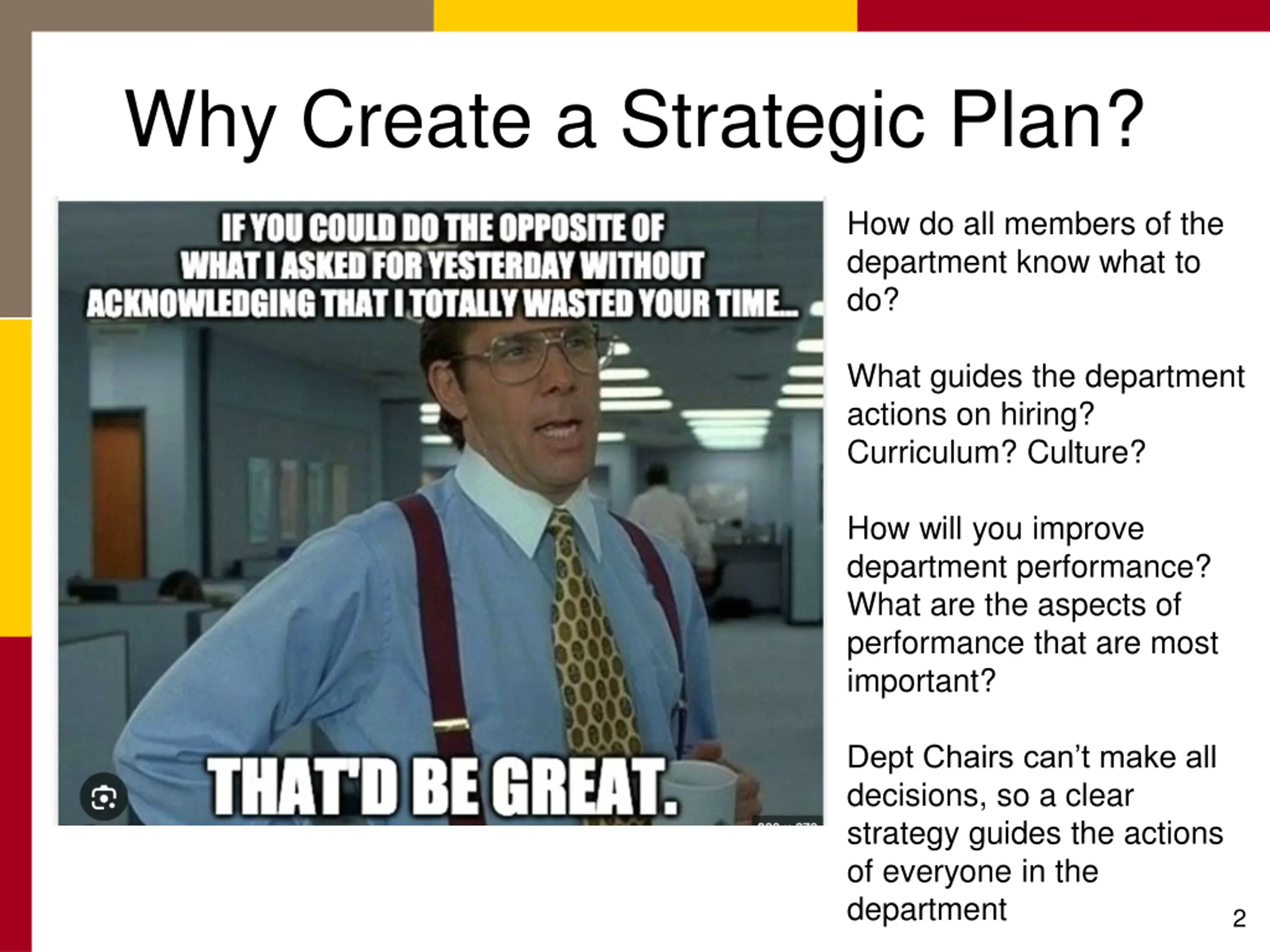Why Create a Strategic Plan? How do all members of the department know what to do? What guides the department actions on hiring? Curriculum? Culture? How will you improve department performance? What are the aspects of performance that are most important? Dept Chairs can t make all decisions, so a clear strategy guides the actions of everyone in the department 2