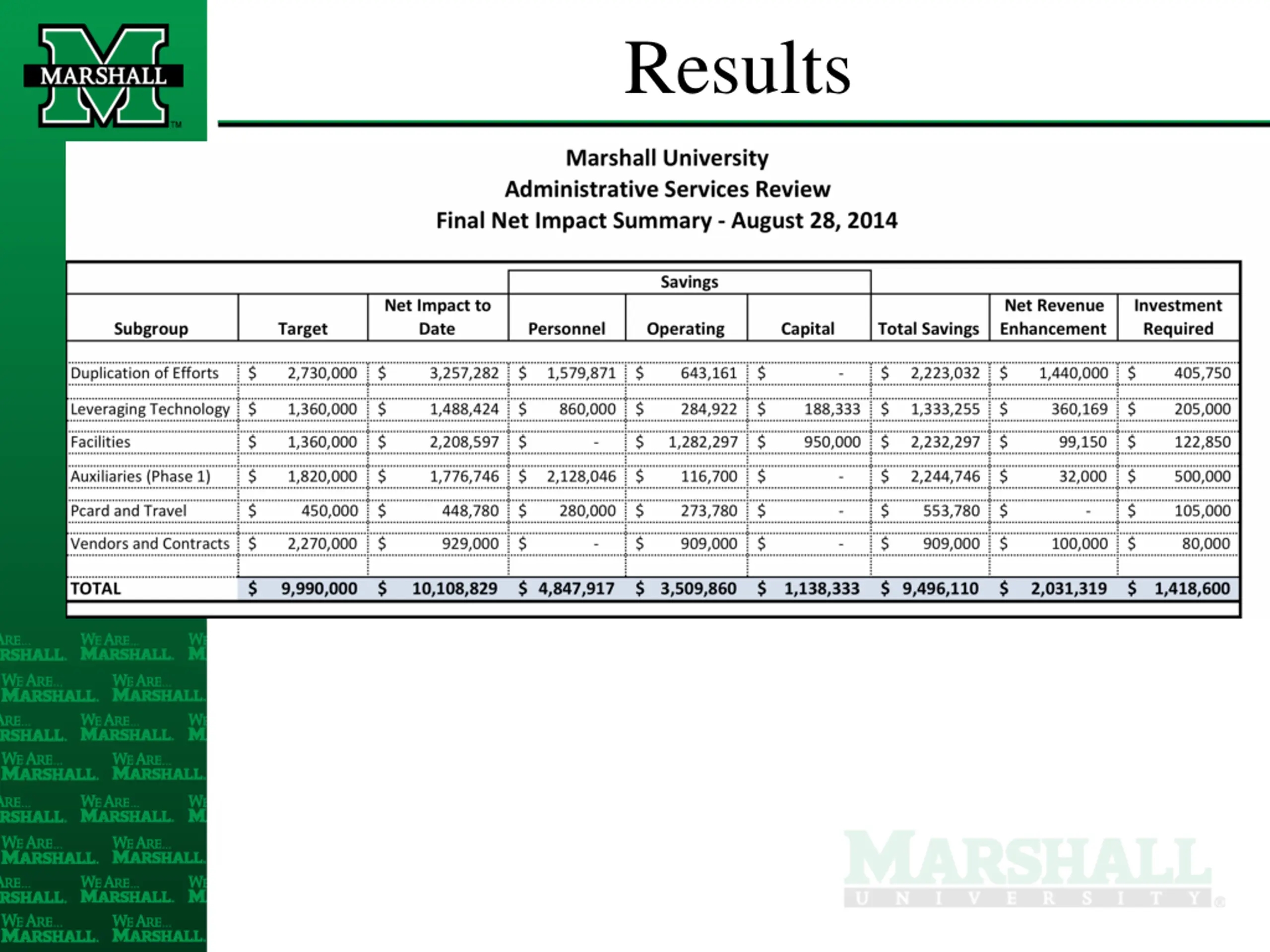 Vision 20/20: Strategic Planning to Sustain Marshall s Future How will the University define and sustain its future? State and Federal Funding challenges Declining enrollment Inability to compensate through tuition increases Marshall s strategic planning process will help us determine how we can thrive in a dramatically changing public funding environment. Challenge: Improve Net Revenue (Revenue-Cost) so we can invest in people, programs and facilities. Retreat #1 October 11, 2013 Retreat #2 March 25, 2014