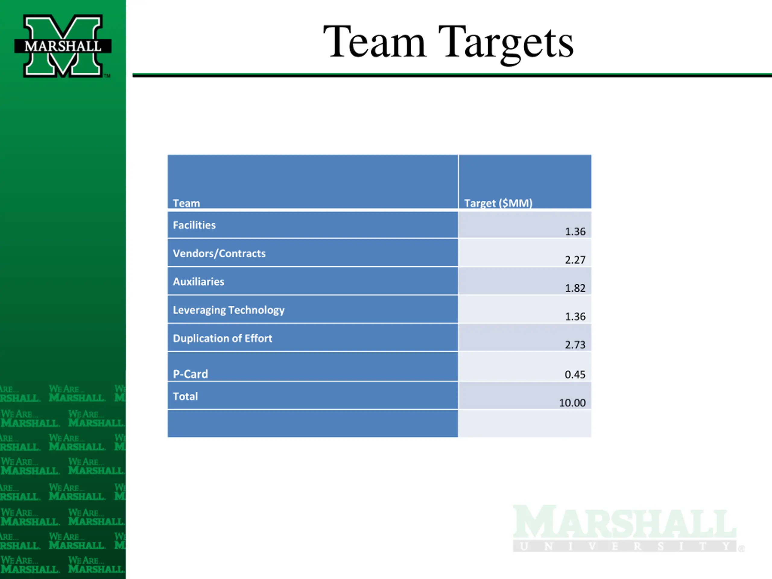 Team Targets Team Target ($MM) Facilities 1.36 Vendors/Contracts 2.27 Auxiliaries 1.82 Leveraging Technology 1.36 Duplication of Effort 2.73 P-Card 0.45 Total 10.00