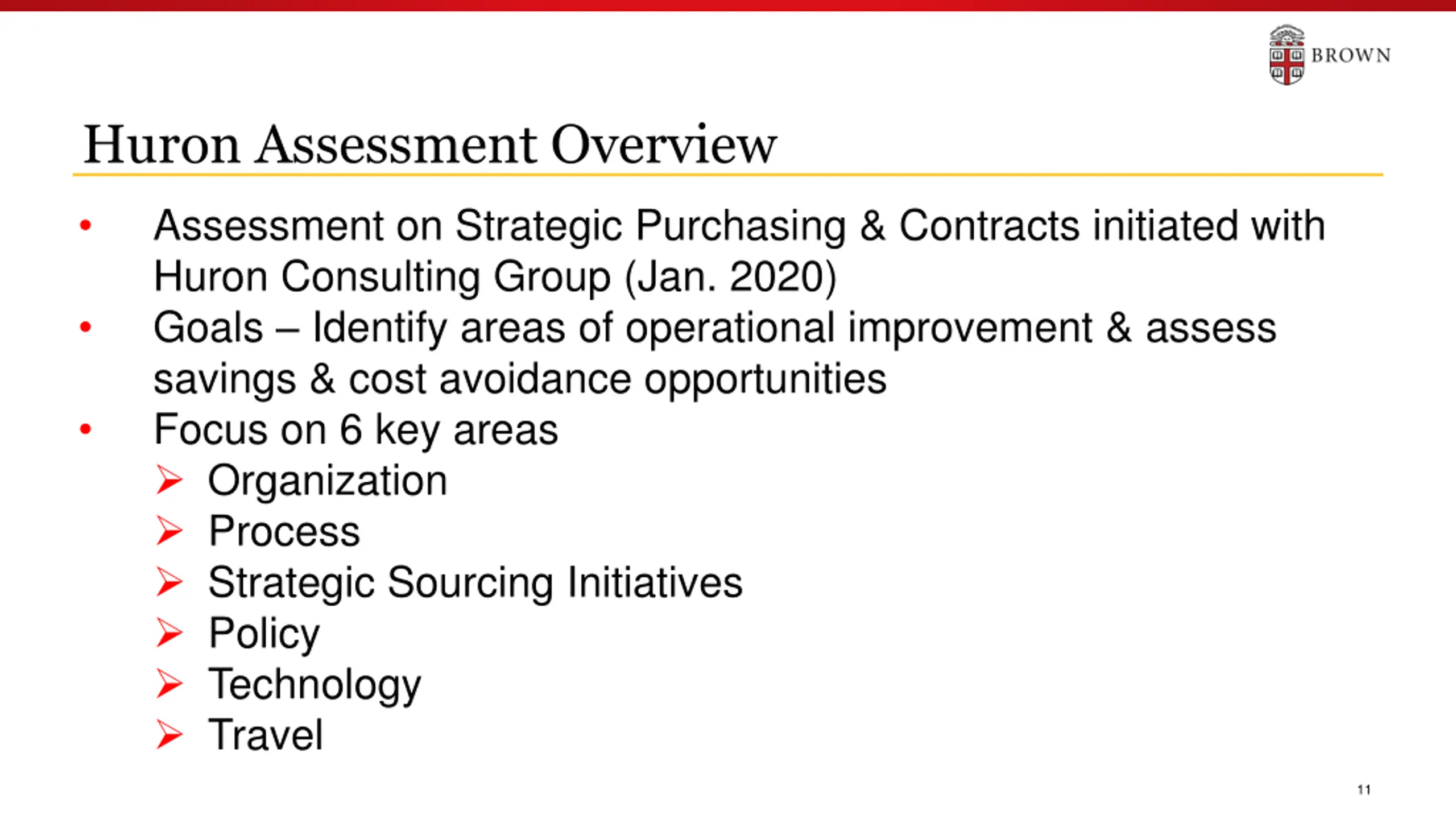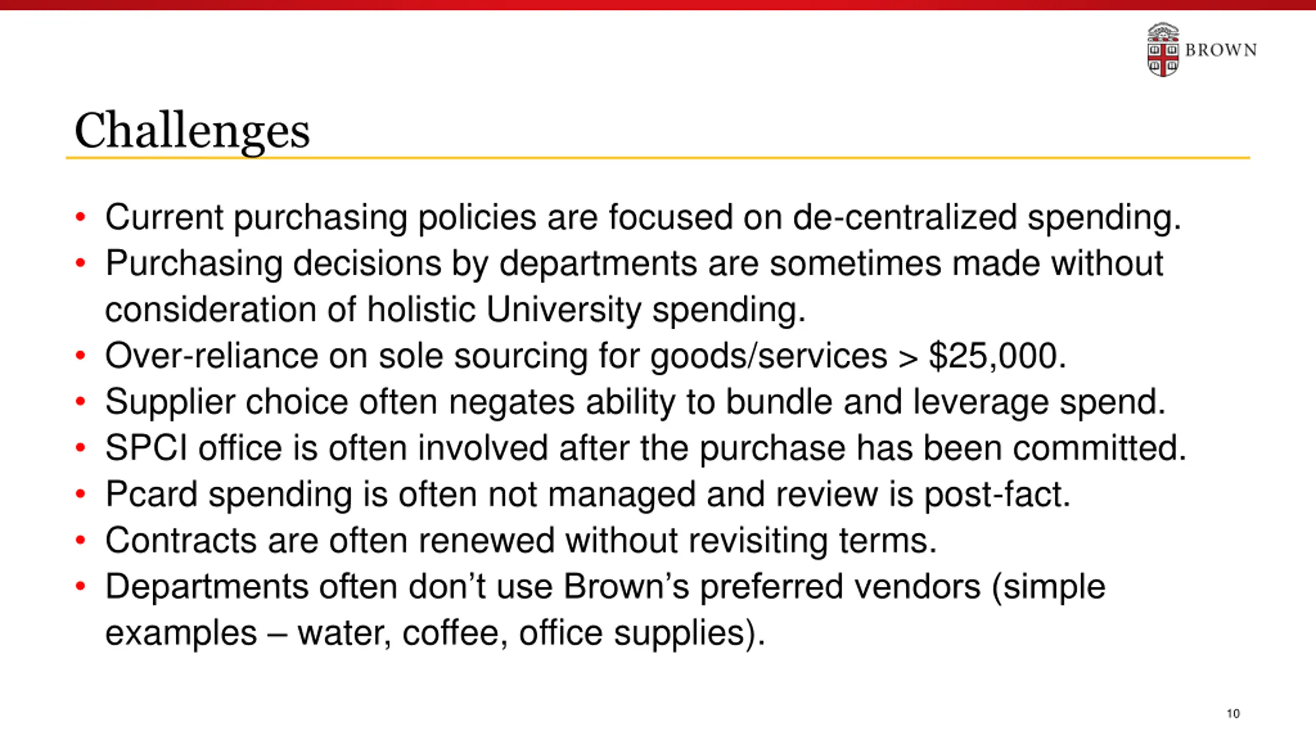 Challenges Current purchasing policies are focused on de-centralized spending. Purchasing decisions by departments are sometimes made without consideration of holistic University spending. Over-reliance on sole sourcing for goods/services > $25,000. Supplier choice often negates ability to bundle and leverage spend. SPCI office is often involved after the purchase has been committed. Pcard spending is often not managed and review is post-fact. Contracts are often renewed without revisiting terms. Departments often don t use Brown s preferred vendors (simple examples water, coffee, office supplies). 10