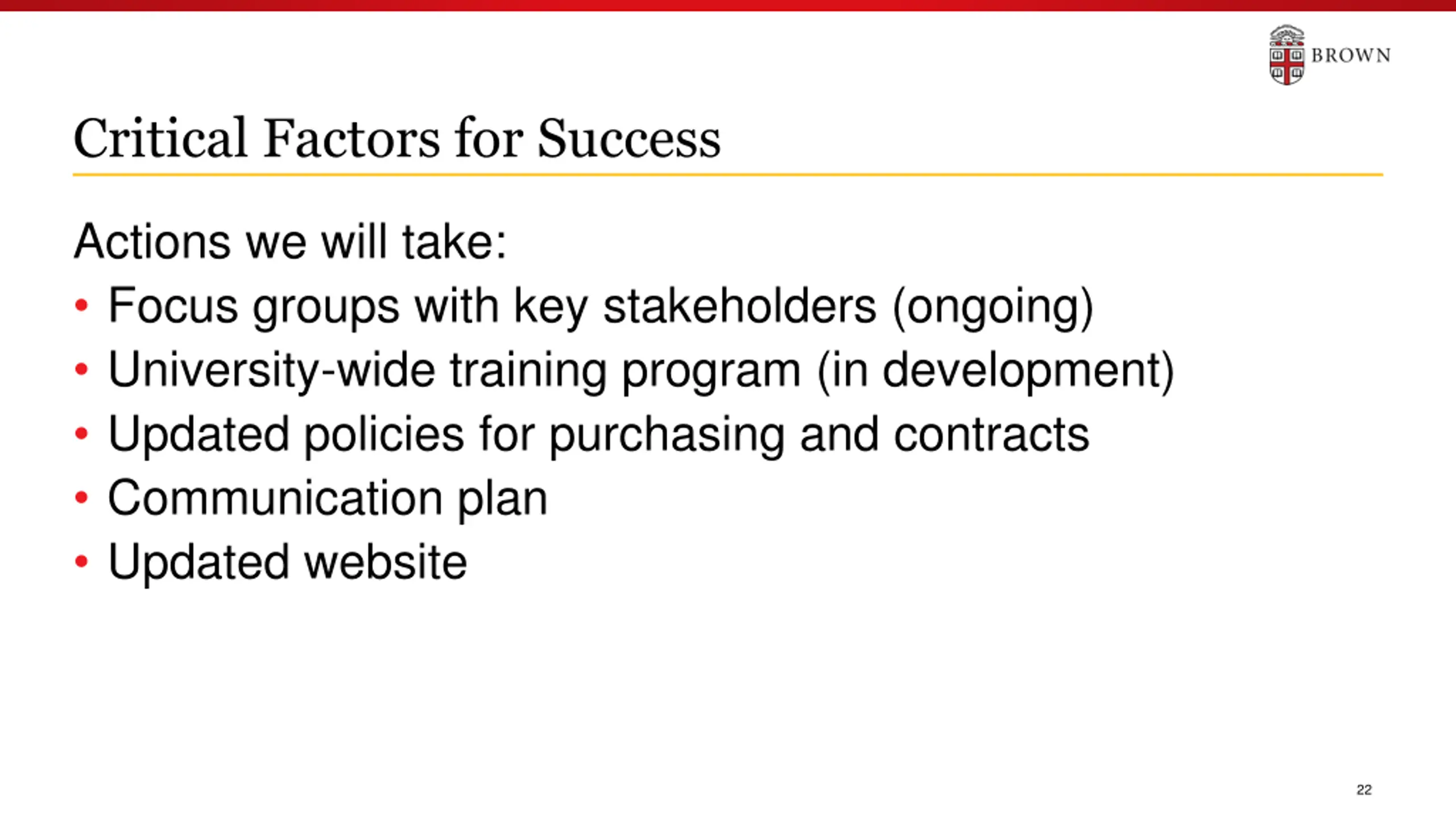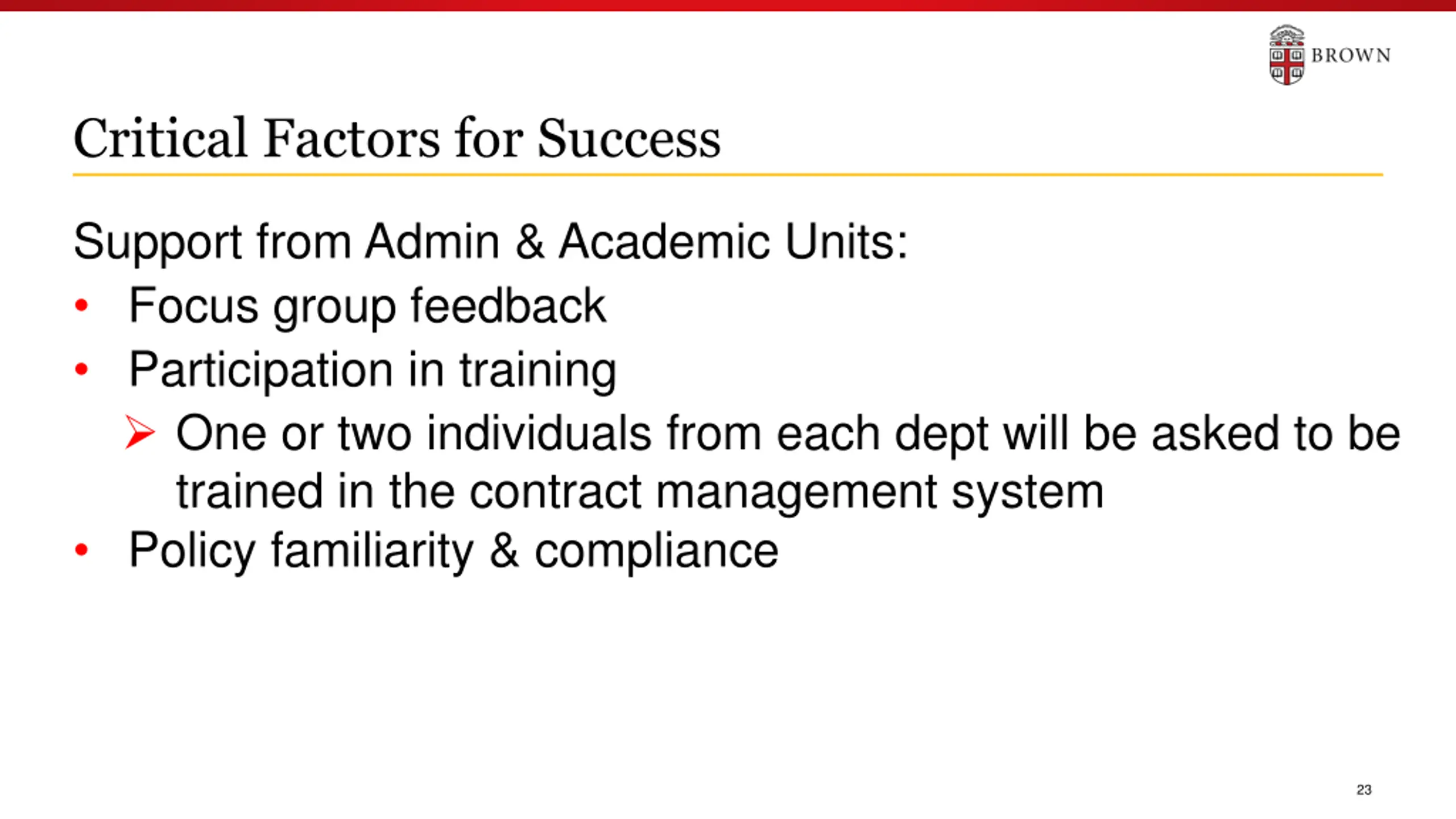 Critical Factors for Success Actions we will take: Focus groups with key stakeholders (ongoing) University-wide training program (in development) Updated policies for purchasing and contracts Communication plan Updated website 22