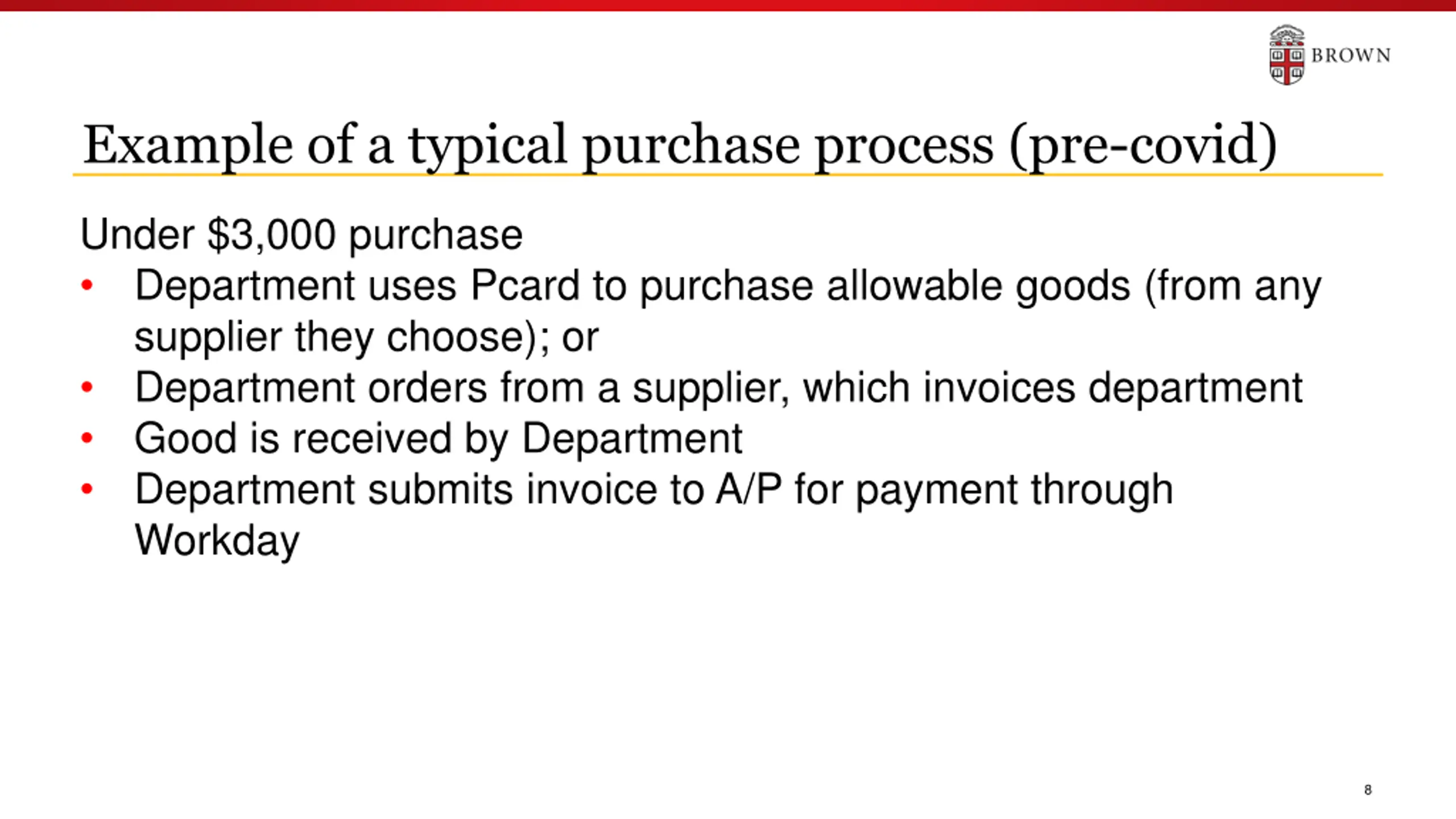 Example of a typical purchase process (pre-covid) Under $3,000 purchase Department uses Pcard to purchase allowable goods (from any supplier they choose); or Department orders from a supplier, which invoices department Good is received by Department Department submits invoice to A/P for payment through Workday 8