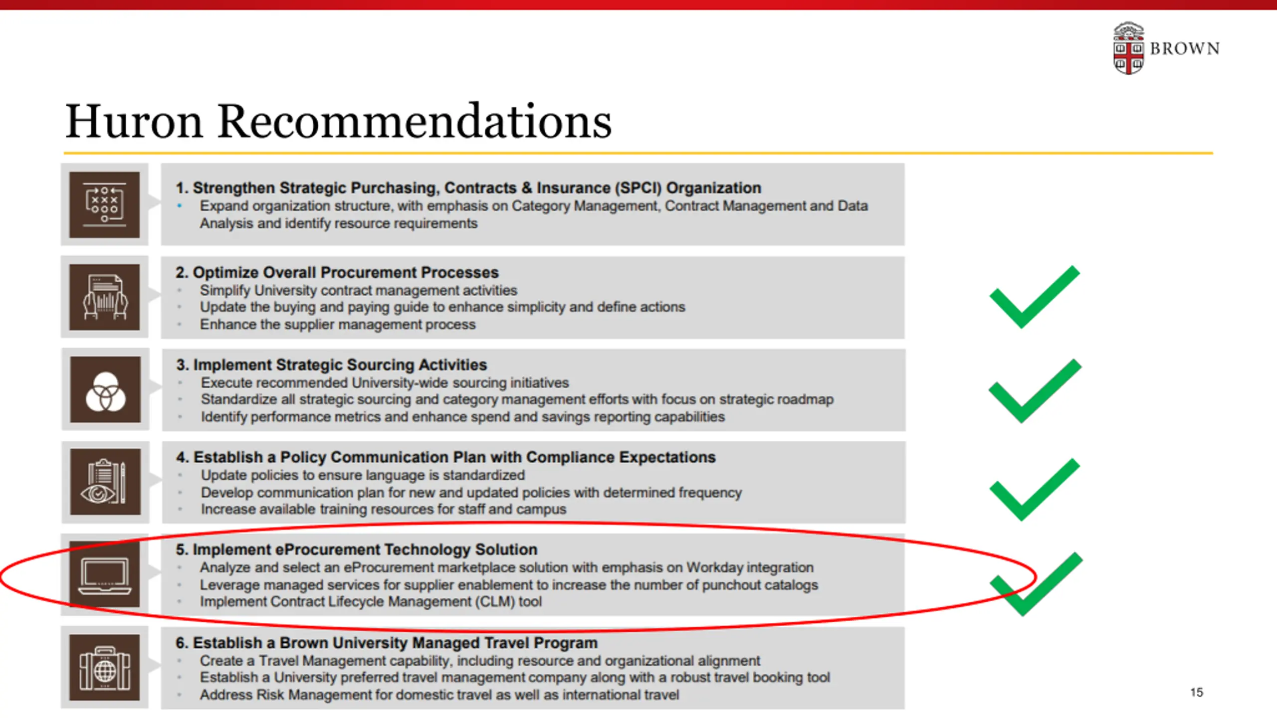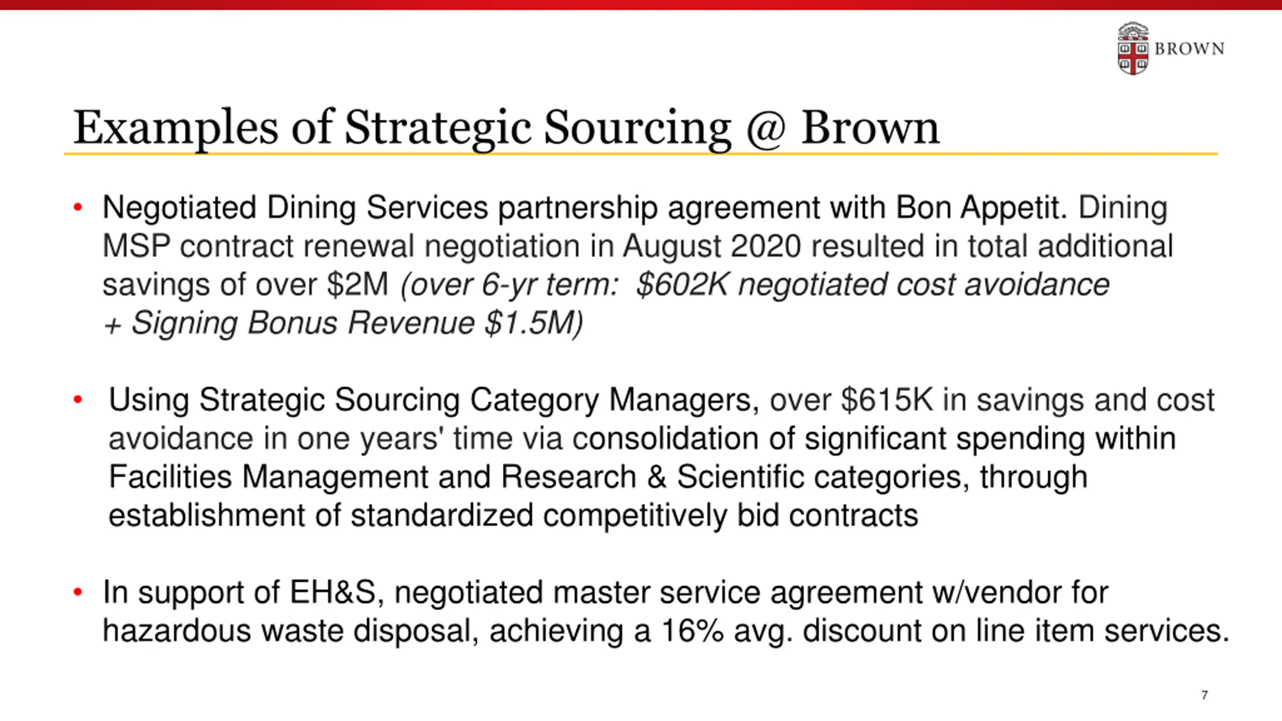 Examples of Strategic Sourcing @ Brown Negotiated Dining Services partnership agreement with Bon Appetit. Dining MSP contract renewal negotiation in August 2020 resulted in total additional savings of over $2M (over 6-yr term: $602K negotiated cost avoidance + Signing Bonus Revenue $1.5M) Using Strategic Sourcing Category Managers, over $615K in savings and cost avoidance in one years' time via consolidation of significant spending within Facilities Management and Research & Scientific categories, through establishment of standardized competitively bid contracts In support of EH&S, negotiated master service agreement w/vendor for hazardous waste disposal, achieving a 16% avg. discount on line item services. 7