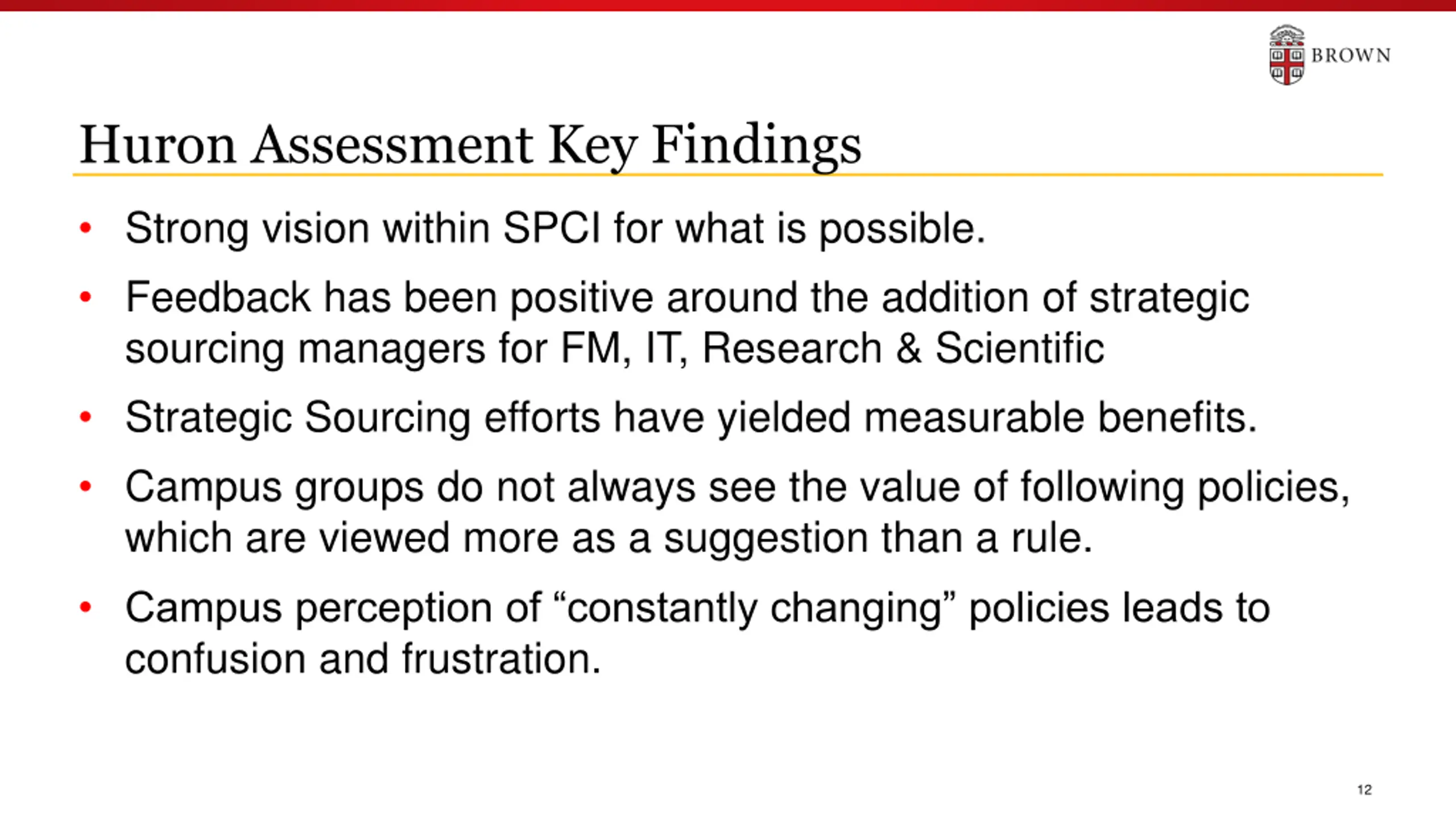Huron Assessment Overview Assessment on Strategic Purchasing & Contracts initiated with Huron Consulting Group (Jan. 2020) Goals Identify areas of operational improvement & assess savings & cost avoidance opportunities Focus on 6 key areas Organization Process Strategic Sourcing Initiatives Policy Technology Travel 11