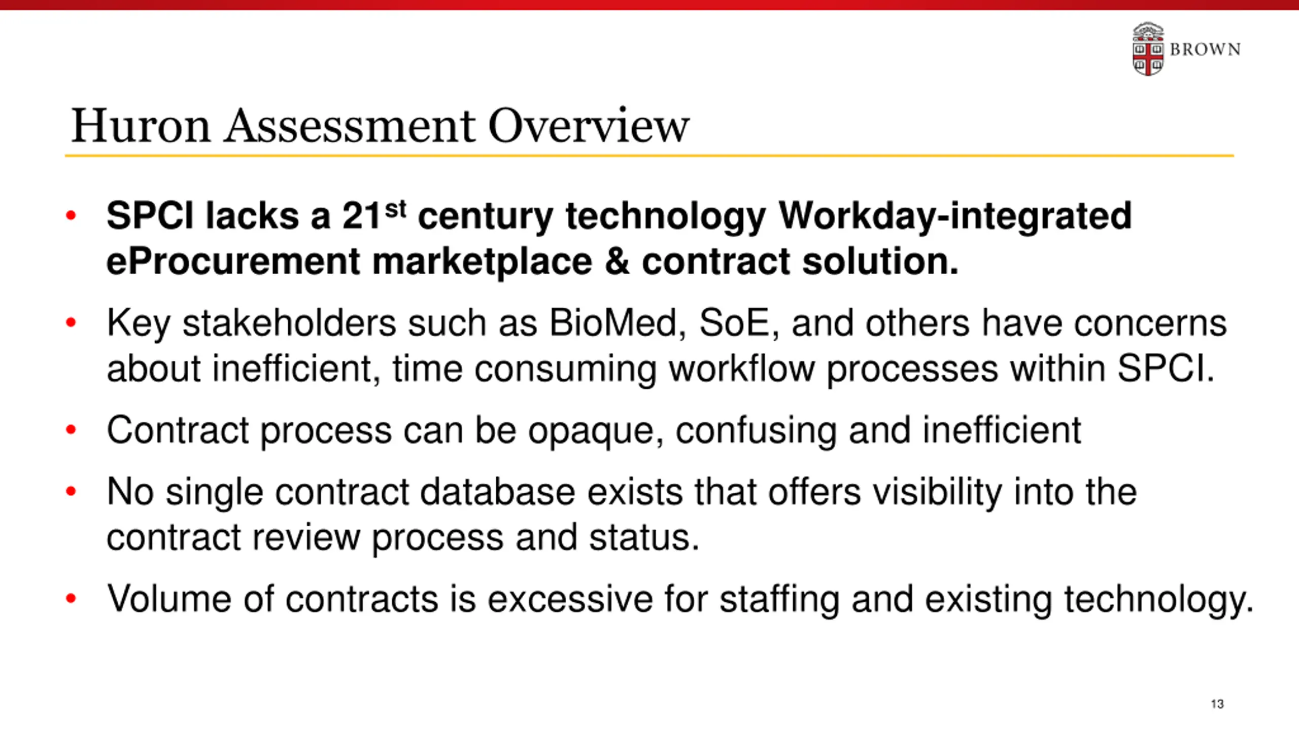 Huron Assessment Overview SPCI lacks a 21st century technology Workday-integrated eProcurement marketplace & contract solution. Key stakeholders such as BioMed, SoE, and others have concerns about inefficient, time consuming workflow processes within SPCI. Contract process can be opaque, confusing and inefficient No single contract database exists that offers visibility into the contract review process and status. Volume of contracts is excessive for staffing and existing technology. 13
