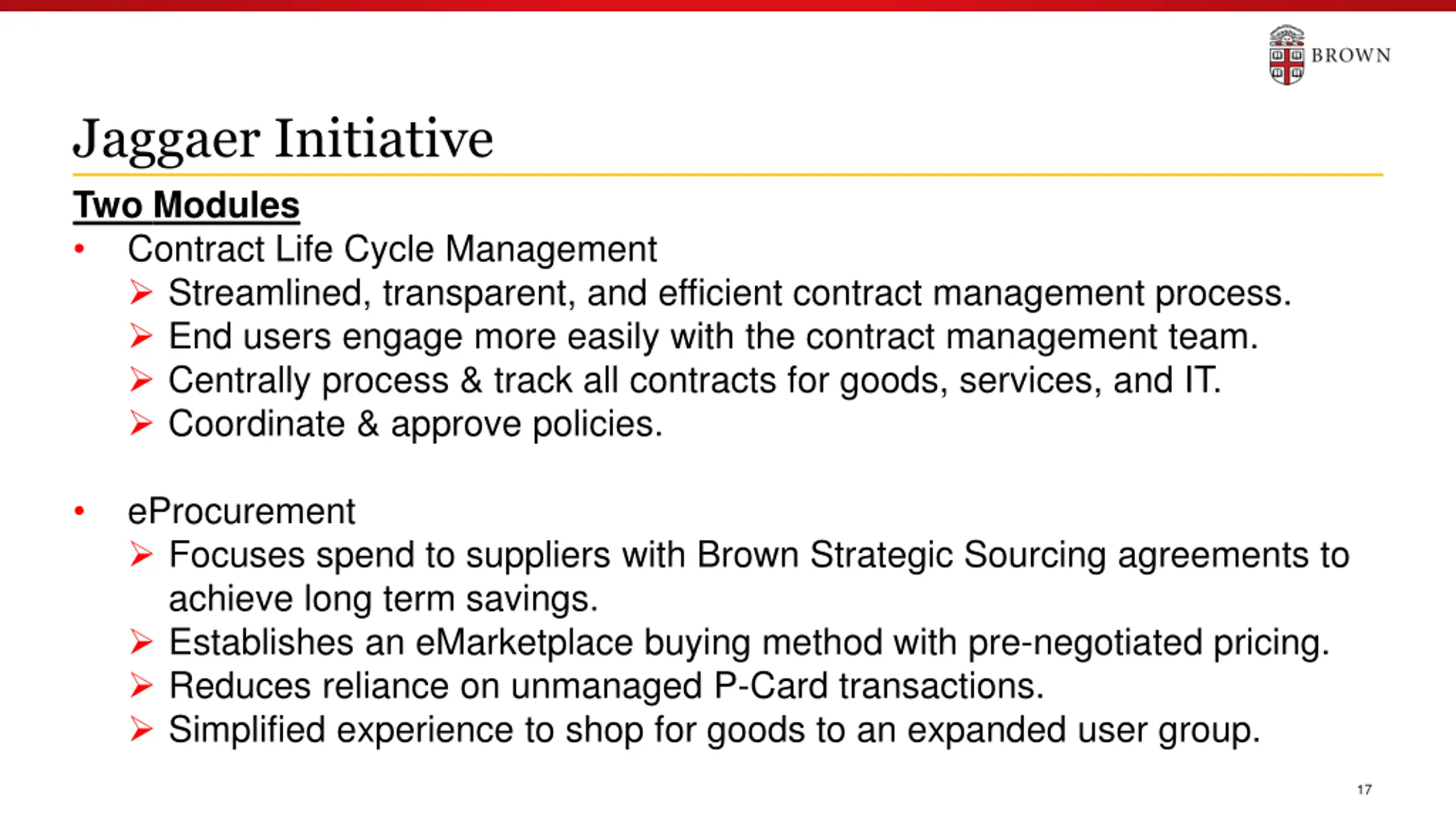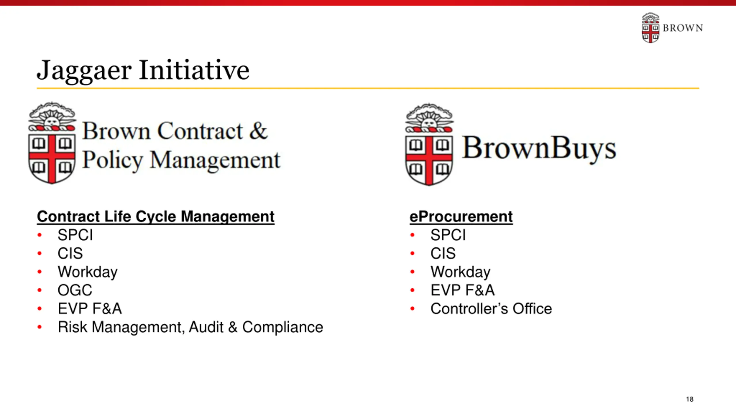 Jaggaer Initiative Two Modules Contract Life Cycle Management Streamlined, transparent, and efficient contract management process. End users engage more easily with the contract management team. Centrally process & track all contracts for goods, services, and IT. Coordinate & approve policies. eProcurement Focuses spend to suppliers with Brown Strategic Sourcing agreements to achieve long term savings. Establishes an eMarketplace buying method with pre-negotiated pricing. Reduces reliance on unmanaged P-Card transactions. Simplified experience to shop for goods to an expanded user group. 17