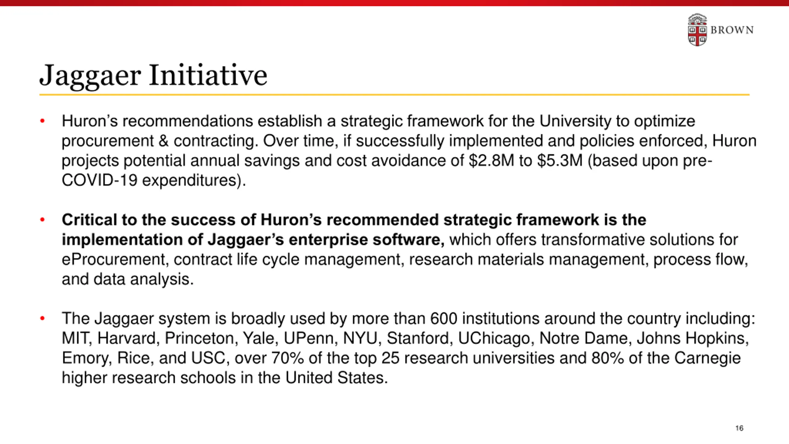 Jaggaer Initiative Huron s recommendations establish a strategic framework for the University to optimize procurement & contracting. Over time, if successfully implemented and policies enforced, Huron projects potential annual savings and cost avoidance of $2.8M to $5.3M (based upon pre- COVID-19 expenditures). Critical to the success of Huron s recommended strategic framework is the implementation of Jaggaer s enterprise software, which offers transformative solutions for eProcurement, contract life cycle management, research materials management, process flow, and data analysis. The Jaggaer system is broadly used by more than 600 institutions around the country including: MIT, Harvard, Princeton, Yale, UPenn, NYU, Stanford, UChicago, Notre Dame, Johns Hopkins, Emory, Rice, and USC, over 70% of the top 25 research universities and 80% of the Carnegie higher research schools in the United States. 16