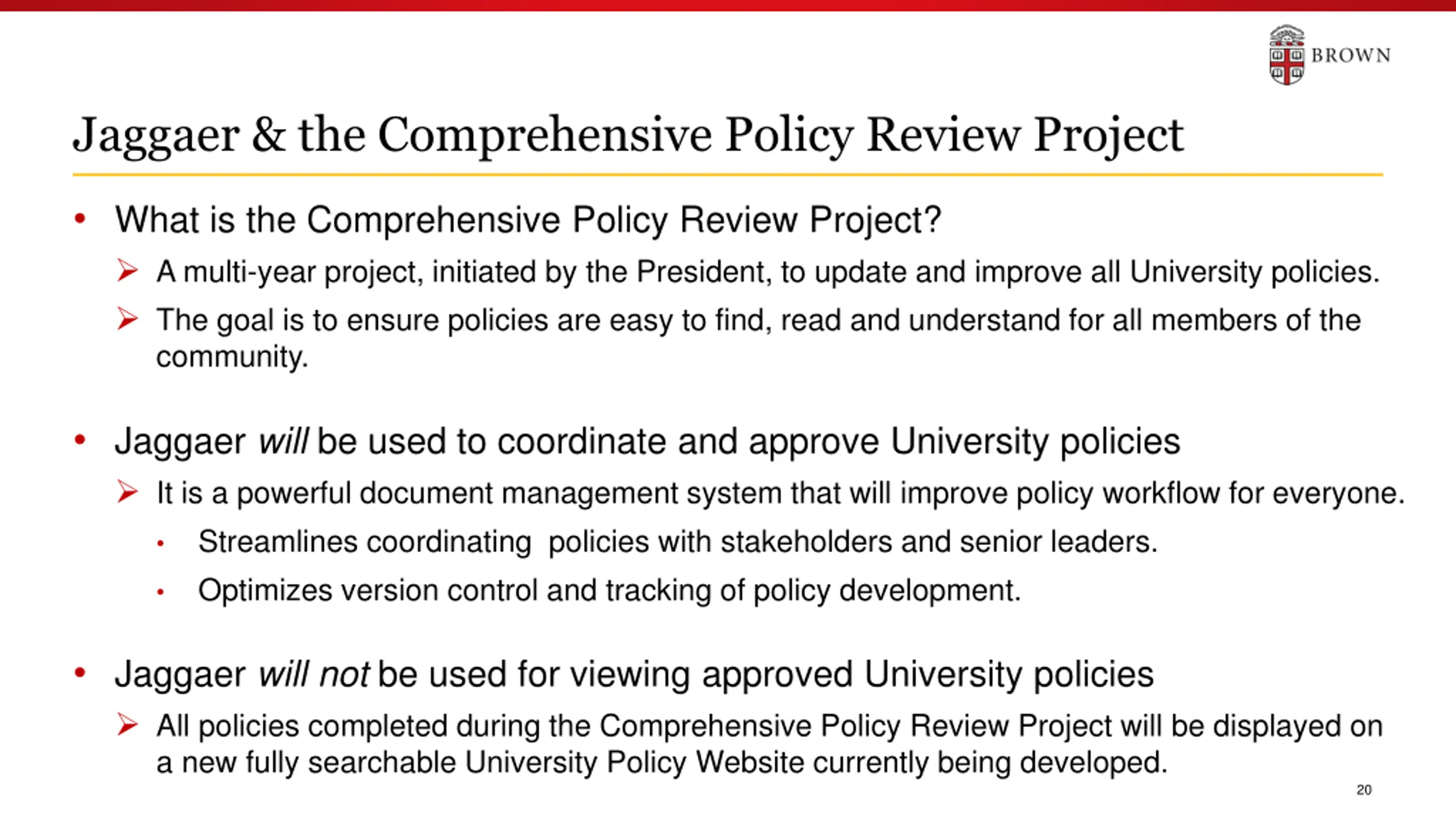 Jaggaer & the Comprehensive Policy Review Project What is the Comprehensive Policy Review Project? A multi-year project, initiated by the President, to update and improve all University policies. The goal is to ensure policies are easy to find, read and understand for all members of the community. Jaggaer will be used to coordinate and approve University policies It is a powerful document management system that will improve policy workflow for everyone. Streamlines coordinating policies with stakeholders and senior leaders. Optimizes version control and tracking of policy development. Jaggaer will not be used for viewing approved University policies All policies completed during the Comprehensive Policy Review Project will be displayed on a new fully searchable University Policy Website currently being developed. 20